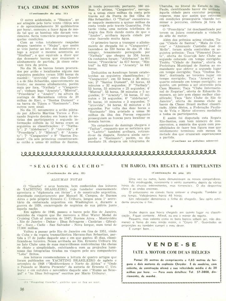 - Observações: O nome Cayru foi uma homenagem ao Visconde de Cayru, mentor do decreto imperial que abriu os portos nacionais ao comércio estrangeiro. Madeiras utilizadas na construção do casco: Louro, Cedro, Cabriuva e Gapriapunha. A quilha de chumbo de 750 Kg foi fundida pela firma Glotz, Schmitz & Cia. A construção do barco teve início em 30 de abril de 1935 e foi concluída em 22 de setembro do mesmo ano. A novidade não era só o projeto, mas também a utilização de todo material produzido no RS. Uma preocupação da época de mostrar a força da indústria gaúcha. A construção do barco obedeceu a direção do engenheiro naval Roberto Funk, com a assistência de Jacob Zeller, Roberto Moritz e José Piersch. Na exposição comemorativa do Centenário da Revolução Farroupilha realizada no Parque da Redenção, o Cayru foi exposto no pavilhão do Rio Grande do Sul. Milhares de pessoas subiram por uma escada para vê-lo. Foi um sucesso. A Comodoria aproveitou para imprimir um folheto explicativo para ser distribuído aos visitantes, promovendo o Veleiros do Sul, a construção naval e o iatismo em Porto Alegre (informações coletadas na edição número 104 da revista O Minuano, do Veleiros do Sul, em 2005 – https://vds.com.br/pt/comunicacao/por-dentro-do-vds/11365-memoria-minuano-o-inovador-barco-cayru).