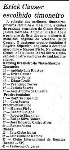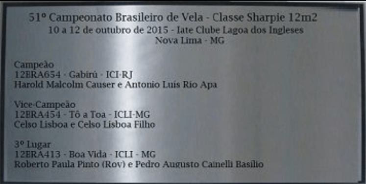 | Torneio Luso Brasileiro de Sharpie – Niteroi – RJ | Antonio Luís Galvão do Rio Apa e Haroldo Causer | Gabiru – BL 654 | 2 vezes em segundo e 1 vez em terceiro… anos? | |