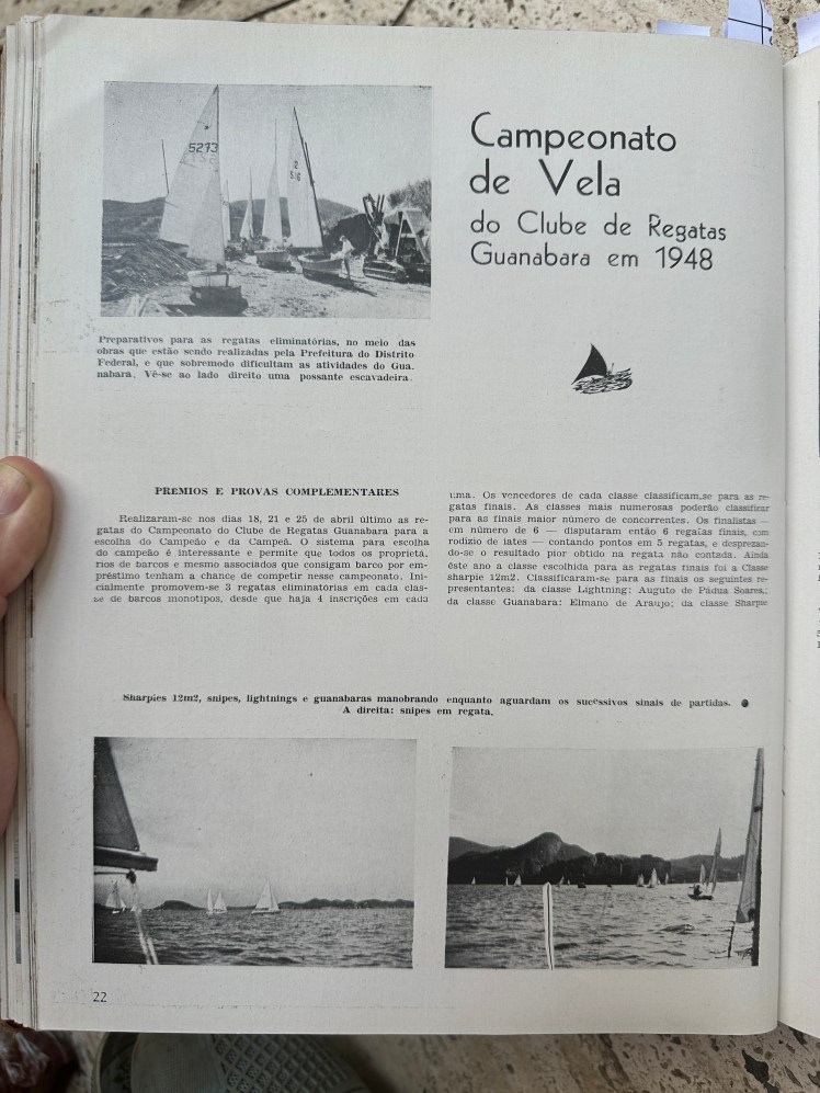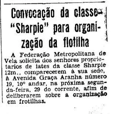 - Durante o Campeonato Brasileiro de Sharpie realizado na raia do Iate Clube de Ramos – RJ, participaram 18 veleiros dos 46 veleiros cadastrados na época em todo o país. ↩︎