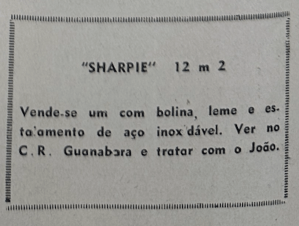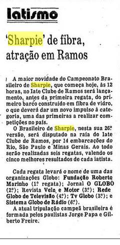 Aparentemente, em junho de 1981, no lançamento do Sharpie de fibra-de-vidro durante o Campeonato Brasileiro (com 18 Sharpies participando na raia) realizado na raia do Iate Clube de Ramos – RJ, foram vendidos 10 veleiros a um preço de Cr$ 150 mil, com velas e outros equipamentos.