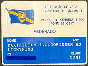 Mas minha vida em um veleiro começou vários anos depois, no ano de 1986 (ver carteirinha de federado FEVESP abaixo), quando comecei a velejar como “baloneiro” no veleiro da classe Lightning de nome “Brisa“, sob o comando do saudoso Luiz Planas. O veleiro ficava guardado no CDMI – Clube Deportivo Municipal de Iatismo – na Represa de Guarapiranga.