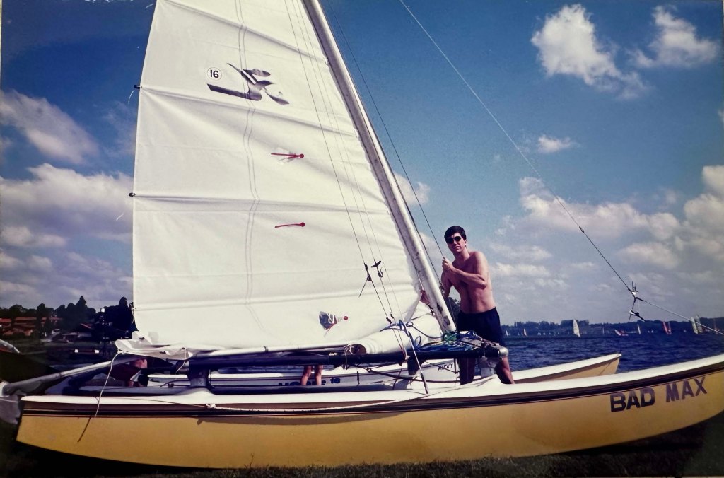 Bem, resumindo, vendi a prancha Mistral com todos os equipamentos e, no dia seguinte, fui comprar o HC-16… tudo muito simples e sem complicações. Então, dias depois, instalei um engate para o reboque da carreta no meu carro e retirei o veleiro levando o mesmo para o CDMI, que ficava a apenas uns dois quilómetros de onde o veleiro estivera abandonado. Posteriormente, tive de fazer todo um procedimento burocrático para regularizar o veleiro, que dei o nome de “Bad Max”, e também da carreta, mas o veleiro era meu. Depois vieram as despesas com peças, roldanas, dois novos trapézios, um trampolim e um par de “maravilhosos” lemes de madeira fabricadas pelo Flório. Um ano depois comprei um jogo novo de velas importadas que custaram uma fortuna! Tudo comprado do saudoso Tom, da Tom & Cat.