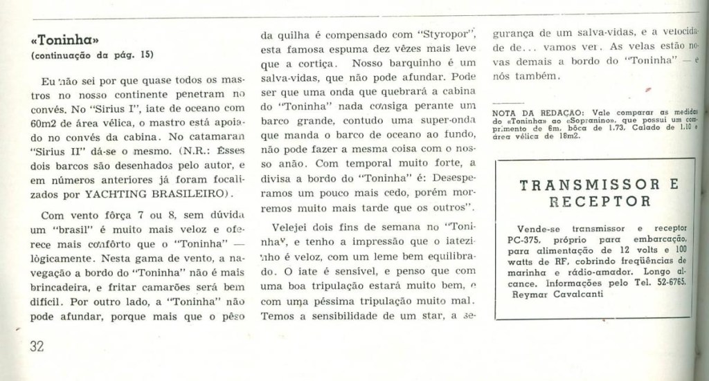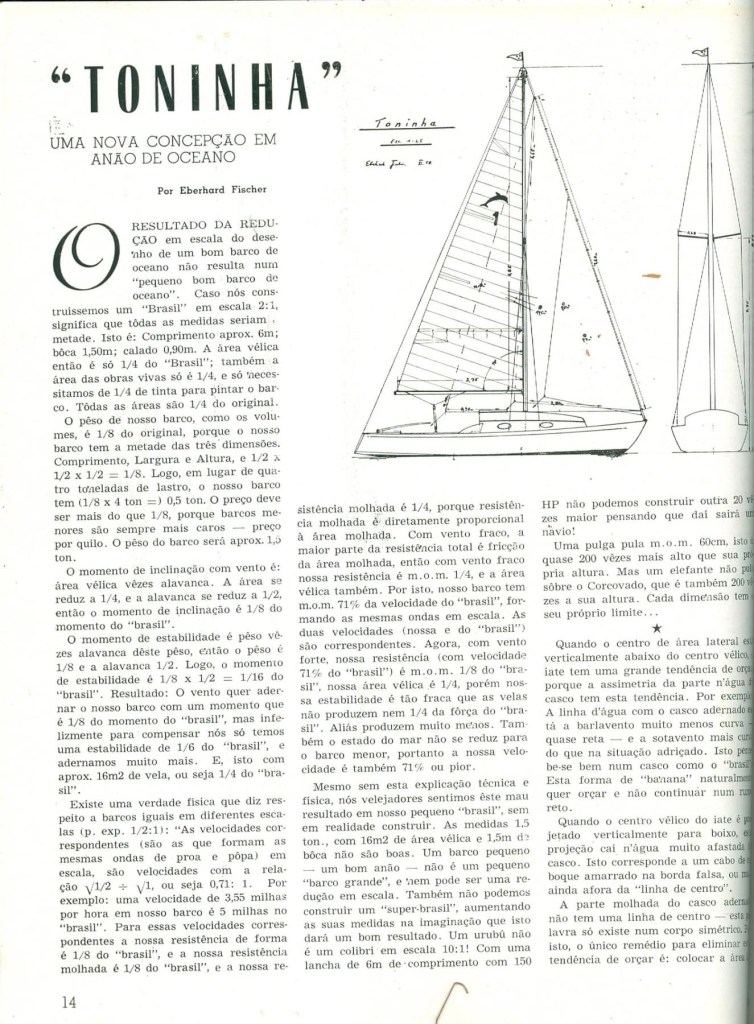 Reportagem sobre o veleiro Classe Toninha na Revista Yachting Brasileiro de junho de 1959 – Escrito por: Eberhard Fischer