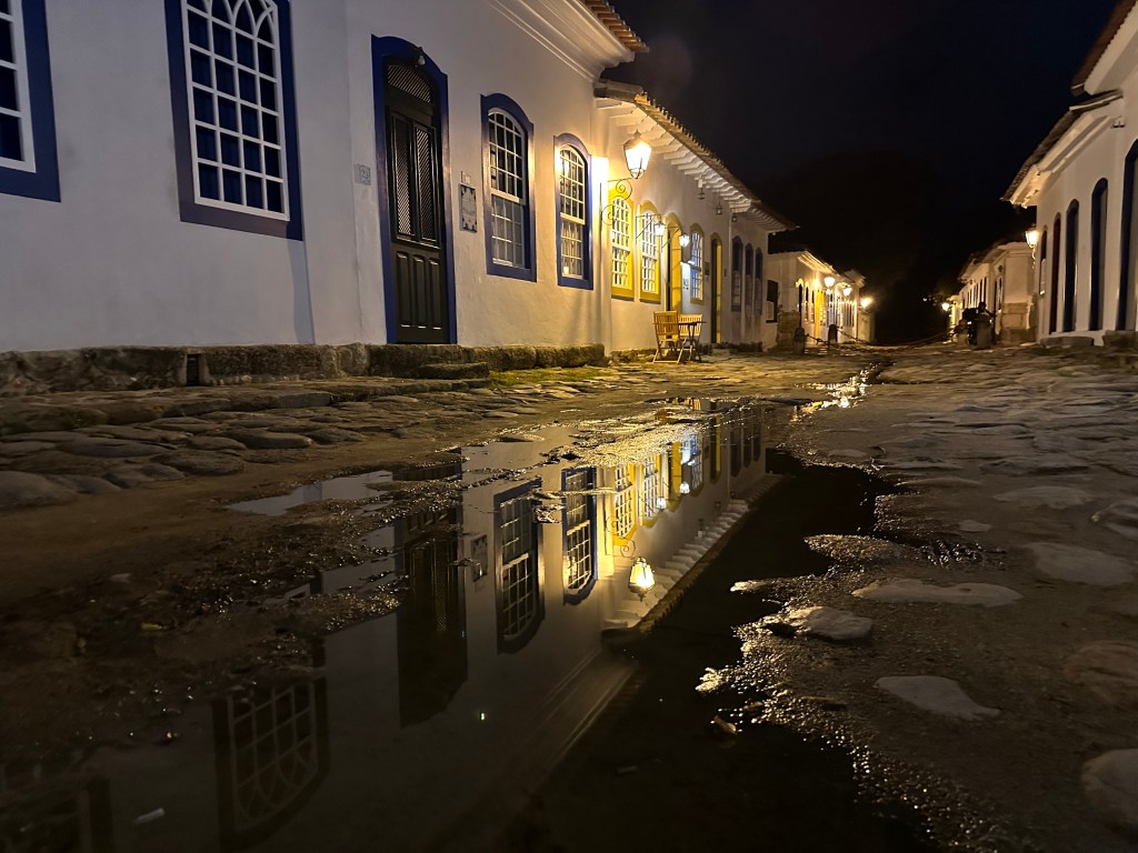 O bom de viajar pela costa brasileira é poder viver a experiência de experimentar a cultura e a arte brasileira, neste caso, a colonial, da bela cidade de Paraty no RJ. Na foto o reflexo das casas de fachada colonial na poça d’água deixada pela chuva.