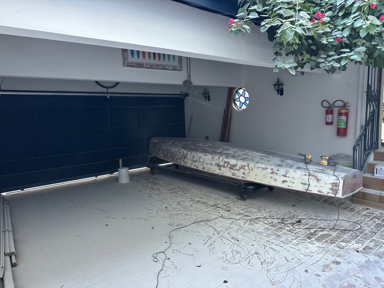 Camada de poeira de fibra, epóxi e tinta espalhados em toda a garagem após ter lixado o casco do veleiro Sharpie 12 m² Gabiru… imagina o trabalho para limpar!