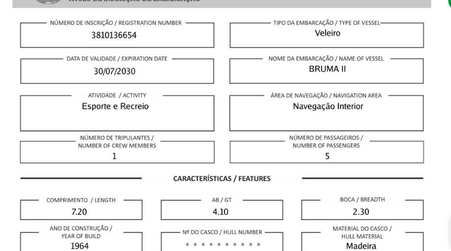 - Calado (m): 0,30 m com bolina levantada e 1,476 m com bolina abaixada