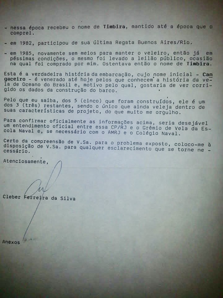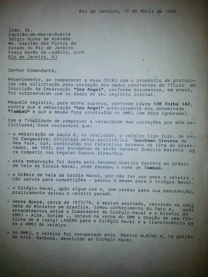Texto de Cleber Ferreira da Silva, antigo proprietário quando o veleiro se chamava Sea Angel. Fornecido por: Luiz Francisco Alencar.