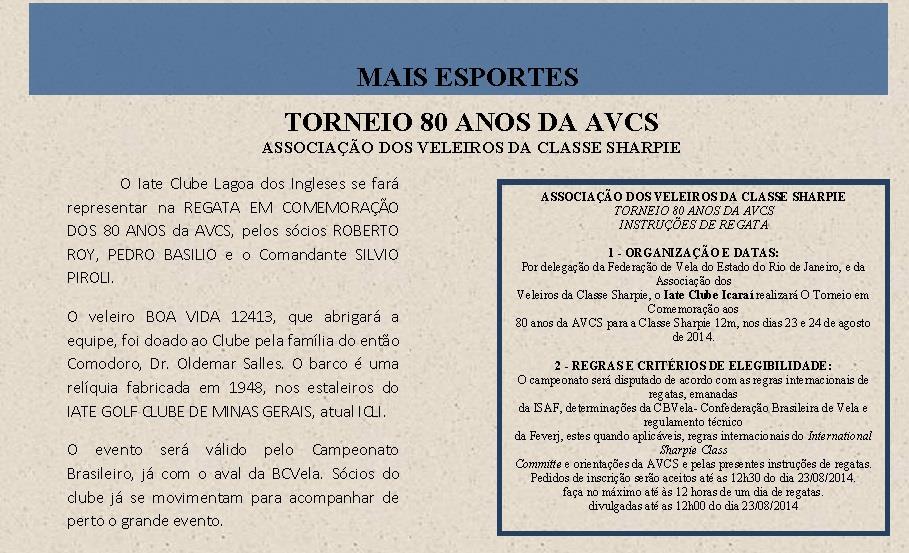 - Observações: Doado ao Iate Clube dos Ingleses pelos sócios Roberto Roy, Pedro Basílio e Silvio Piroli