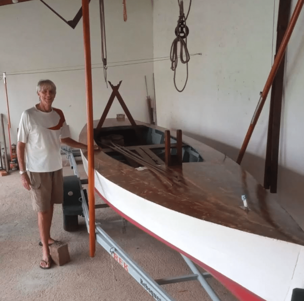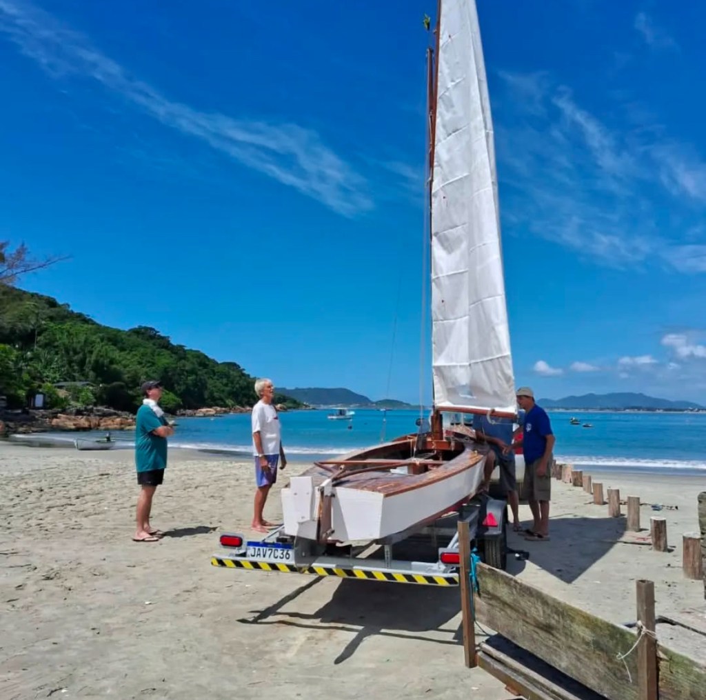 Fotos do Veleiro Flamingo reformando e sendo colocado na água após a reforma (ainda sem nome) por Karl Zalta, na Praia da Pinheira – Palhoça – SC