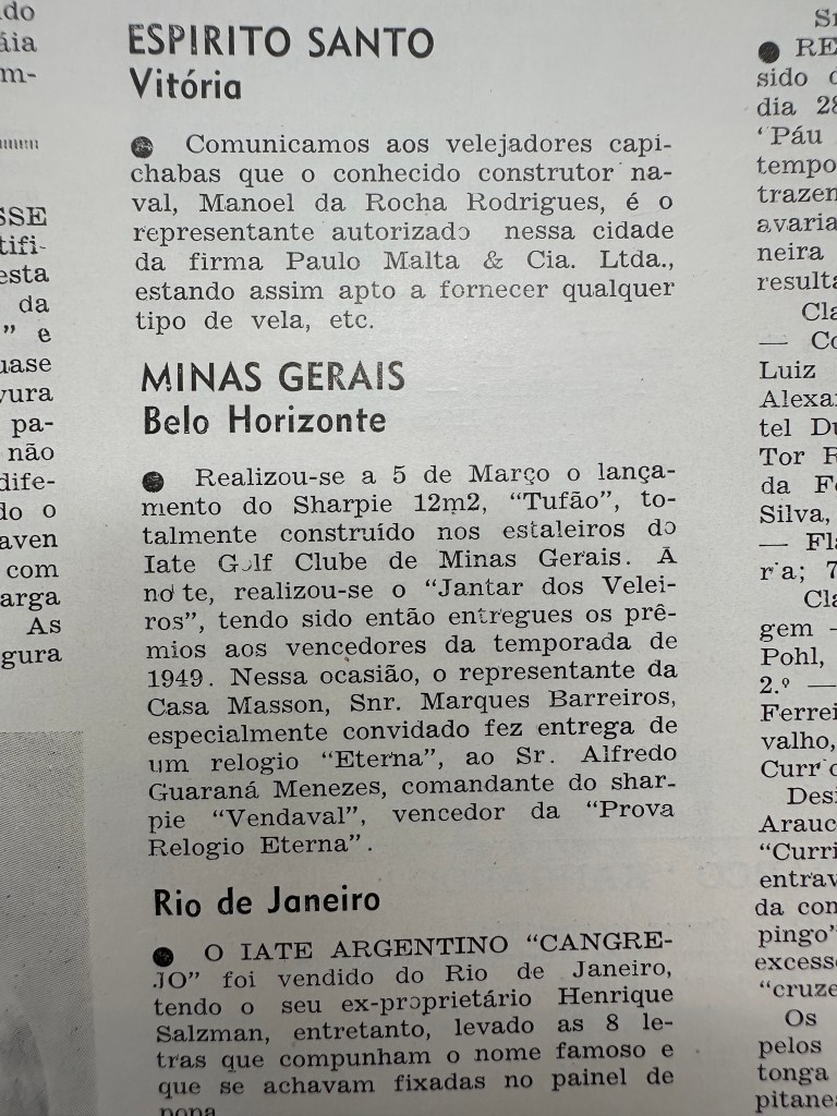 * Realizou-se na noite de 5 de março de 1950, o “Jantar dos Veleiros”, tendo sido então entregues os prêmios aos vencedores da temporada de 1949. Nessa ocasião, o representante da Casa Masson, Sr. Marques Barreiros, especialmente convidado, fez entrega de um relógio “Eterna”, ao Sr. Alfredo Guaraná Menezes, comandante do Sharpie “Vendaval”, vencedor da “Prova Relógio Eterna”. – Matéria na Revista Yachting Brasileiro – No. 67 – Maio de 1950. (ver Fotos abaixo)