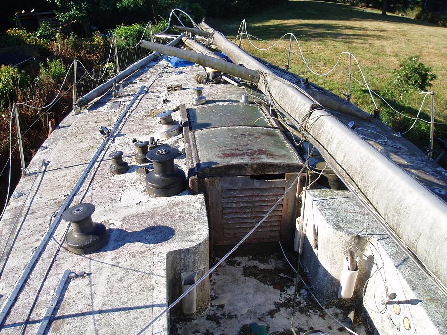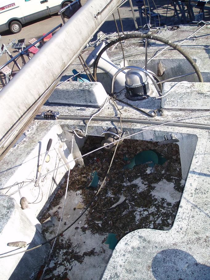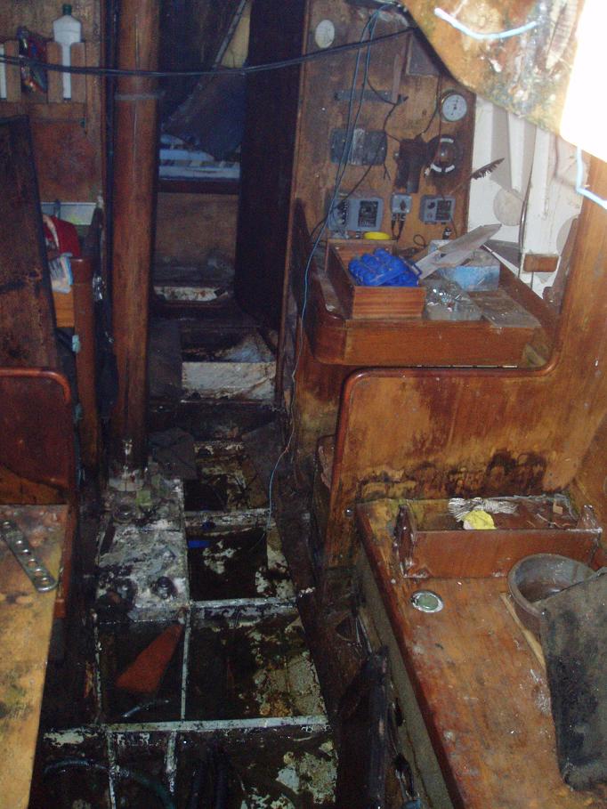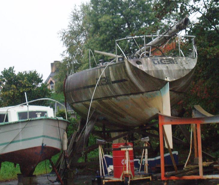 “O barco permaneceu por muitos anos no estaleiro PLYachting, pegou muita água, o interior está em um estado deplorável. Motor em más condições (afogado na água) com uma transmissão de eixo propulsor interessante, mas bizarra e complexa, passando na frente do motor. “O barco foi comprado há 2 ou 3 anos por Yann Labbé pelo preço do chumbo, o interior desmontado por uma equipe de amigos. O casco jateado (camada espessa de revestimento), então coberto por uma lona este ano em Pasco em Concarneau“. Veja fotos abaixo.