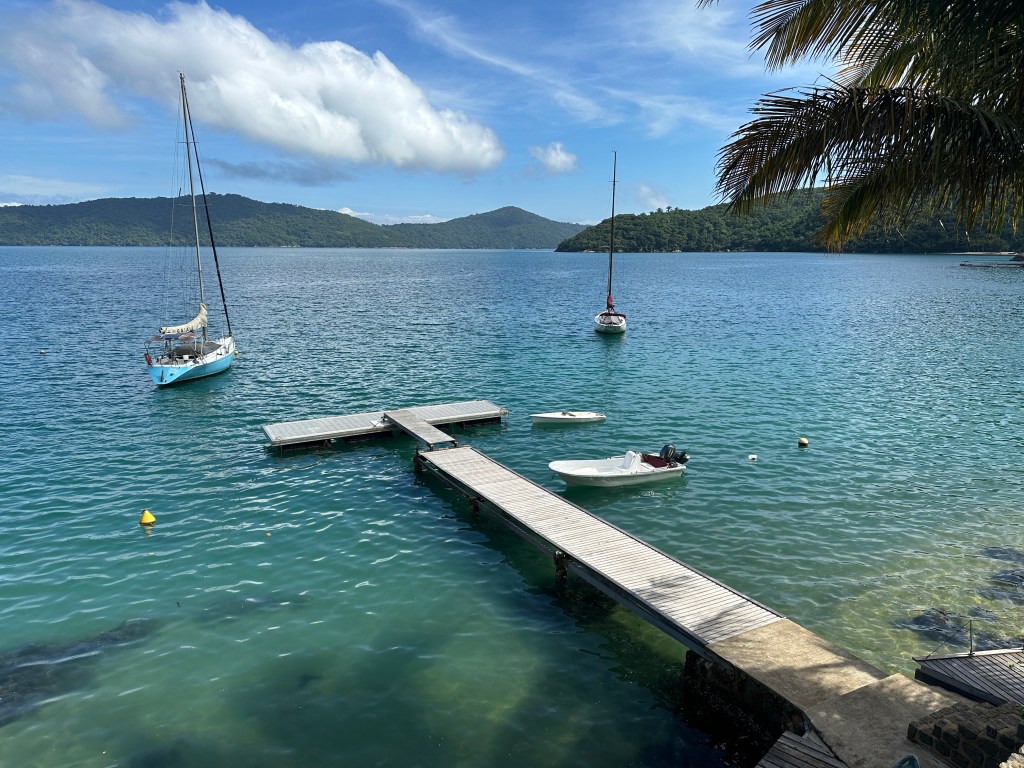 Veleiros Gaia 1 (FyC 40 1987) e Cangaceiro (Classe Brasil 1954) aproam ao vento em poitas no Saco do Mamanguá – RJ.