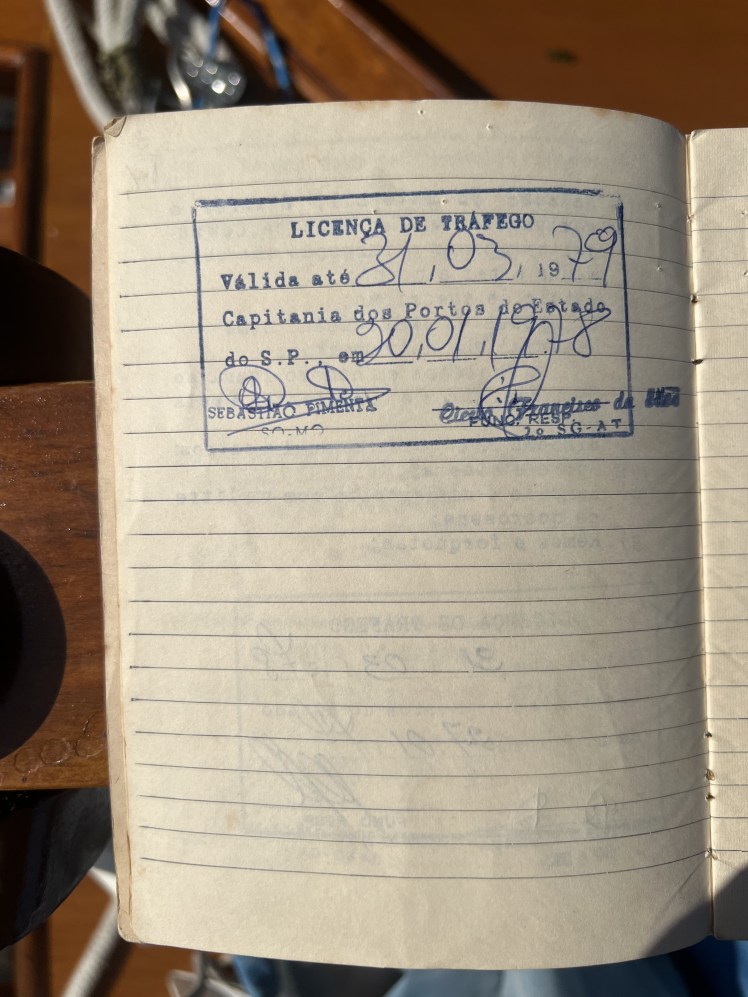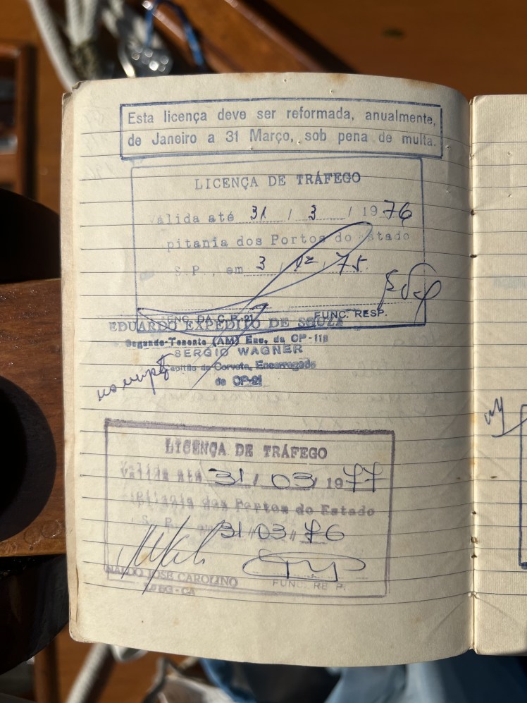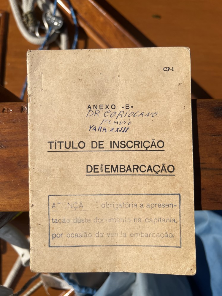 Copia do Título de Inscrição de Embarcação do ano 1975 do veleiro YARA XXI (apesar de na capa dizer XXIII). Interessante ler que o veleiro está registrado (onde será que conseguiram esses dados?) com 5,00 metros de comprimento, tonelagem de 1,750, peso máximo de carga (bruta/ líquida) de 0,583, 2,00 metros de boca e para 6 passageiros. Este documento foi fornecido por Francisco Luiz Silva (arquivo pessoal)
