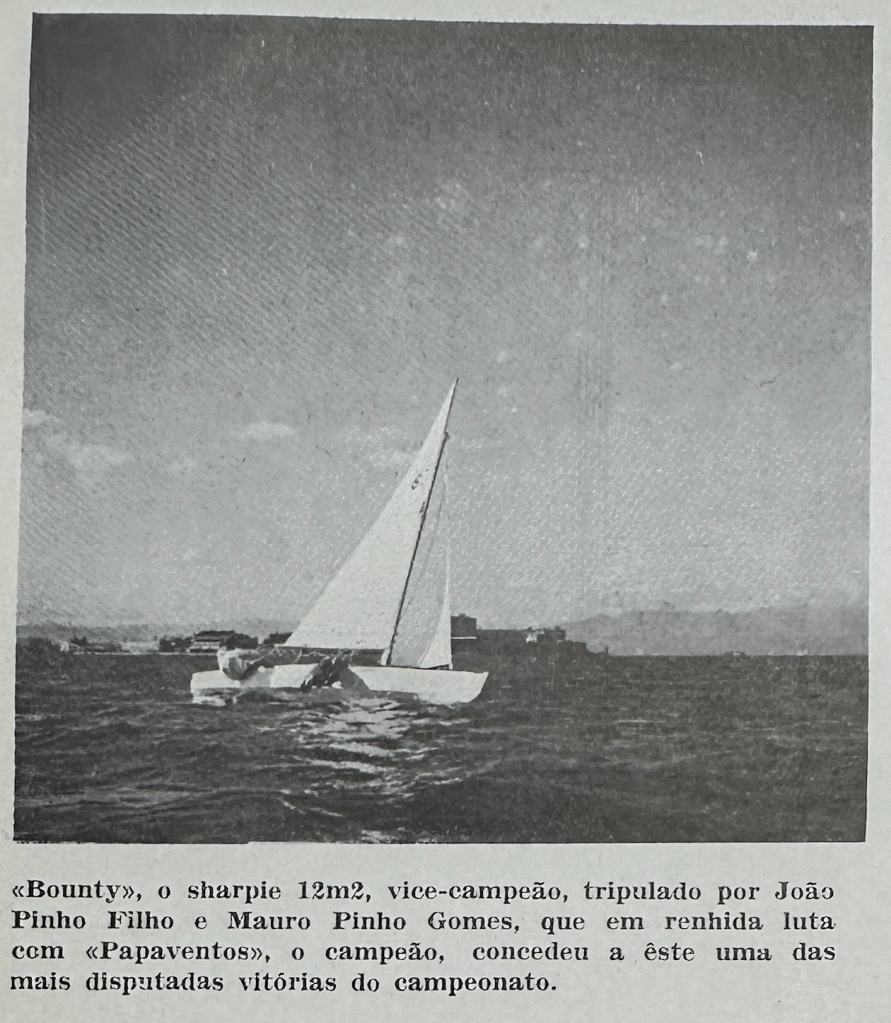 (*) O veleiro “Papaventos“, comandado por Vitor Demaison, foi o “campeão” da Classe Sharpie 12m2 no Campeonato Metropolitano de Vela de 1947 (9 a 30 de novembro de 1947), corrido no Rio de Janeiro. Tendo boa atuação em todas as regatas, ambos veleiros, o “Papaventos” e o “Bounty”, alcançaram contagem igual, porém, na regata de descarte, que serve de desempate, o primeiro conseguiu maior número de pontos, daí a vitória no campeonato.
