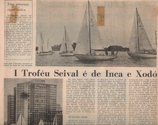 | 1º Troféu Seival 1970 – Nesta primeira edição, o percurso foi até a Ponta das Desertas e retornou ao clube VDS. | 1º lugar da Classe A foi um empate entre os barcos Inca II de Alfredo Bercht e Xodó de Ciro Ney White. O INCA II, terminou em 4h50min18s tripulado por: Alfredo Bercht (cmte.), Mário Bercht, Edson Kraemer, Paulo Scheidegger, Rolf Bercht e Isidro Heredia. |