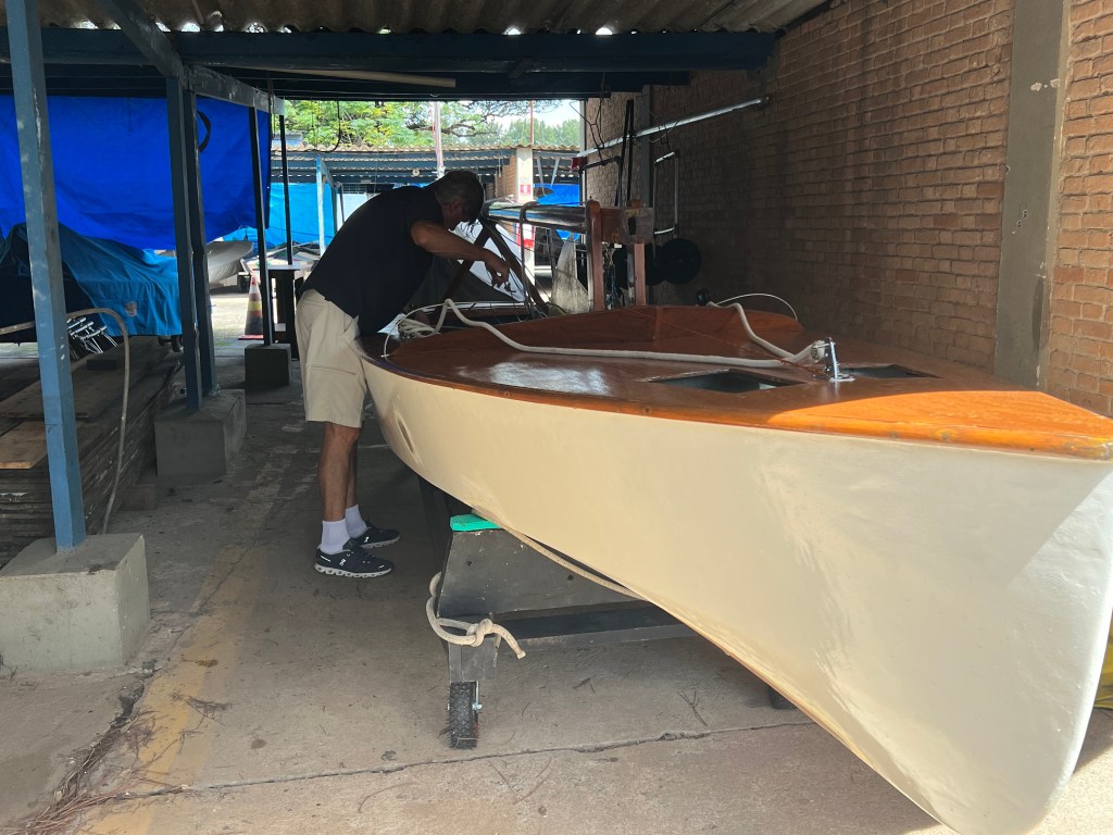 Organizando o veleiro após a velejada. O bom de ter o mastro que retrai, é que fica fácil guardar sob o telhado do box no clube.