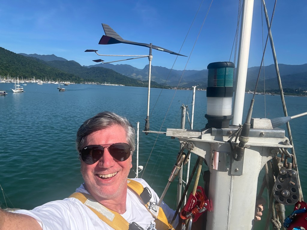 Dia de vistoria e manutenção no topo do mastro do Gaia 1… checando as antigas lampadas incandescentes… um charme se comparadas com as de led… tudo OK… a baía de Paraty como cenário de fundo.