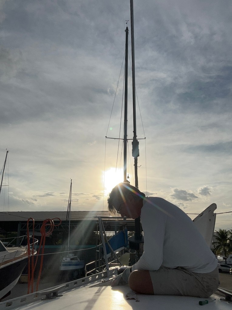 Desde que cheguei no estaleiro Pier 26 na segunda-feira da semana retrasada, vivo outra realidade náutica; a dos velejadores que fazem em seus veleiros sua própria manutenção e reforma… muita coisa para desmontar e muito braço para limpar e lixar… já lixei o deck, o costado, o fundo e, pintei a quilha, pé-de galinha do hélice, fechei os buraquinhos do deck com massa epóxy e pintei de primer e três demãos da nova cor de tinta no costado… amanhã, o dia será de preparo para dar uma camada de primer no deck , preparando para pintura… o Gaia 1 já ganhou uma nova cor… em breve!