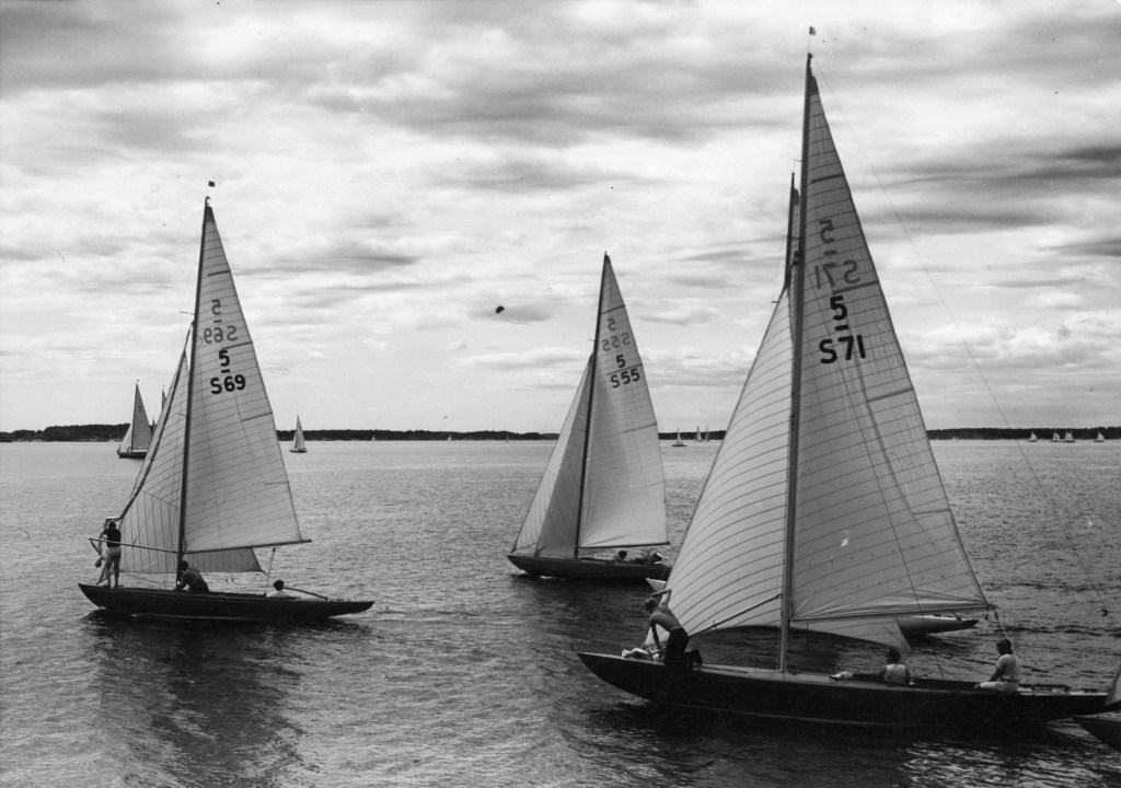 Veleiros 5m RI, com o Greif 5-71 em primeiro plano, Sjutusa 5-77, Hansa 5-70, Winga 5-81 e Sjomej 5-52, instantes depois da largada da regata do 4º aniversário do ICCS (Iate Clube Cruzeiro do Sul) realizada na Represa “Nova” Billings – SP no dia 10/09/1951. Foto: Alberto João na Revista Yachting Brasileiro No. 84 de outubro de 1951. Todos os direitos reservados. Proibida sua reprodução.