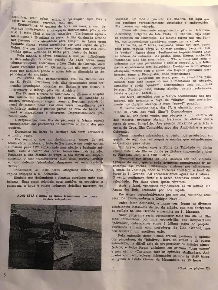 Cópia de artigo extraído da revista Yachting Brasileiro No. 183 de janeiro de 1960 escrito por Henrique Schmidlin intitulado “De Paranaguá ao Rio de Janeiro em Guanabara” – Todos os direitos reservados – Copyright de seus autores/ publicações.