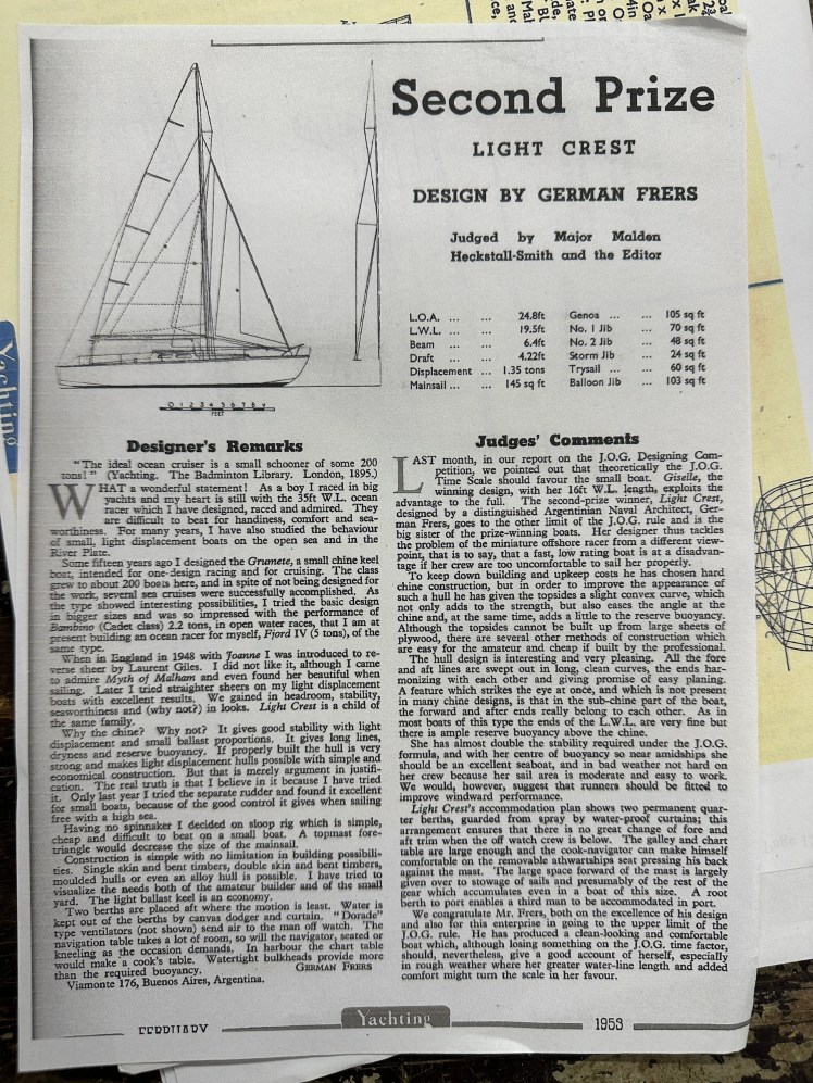 - Observações: O projeto do Light Crest foi premiado no “J.O.G.Design Competition” de 1952 pela revista Yachting World, que também divulgou seu plano de construção na sua edição de fevereiro de 1953.
