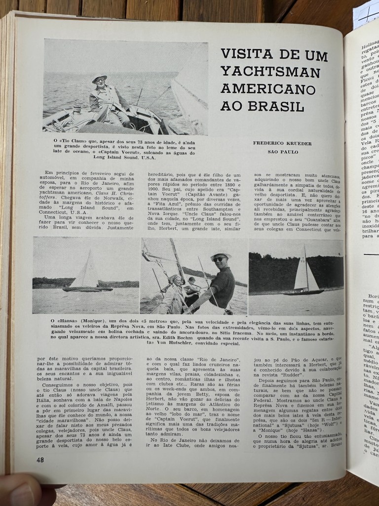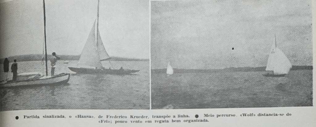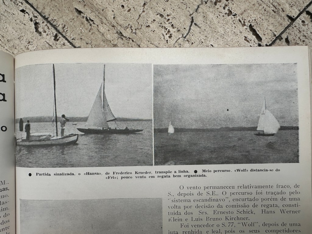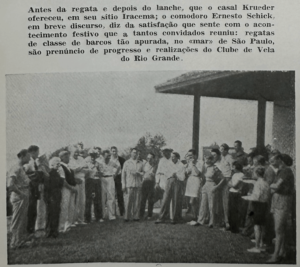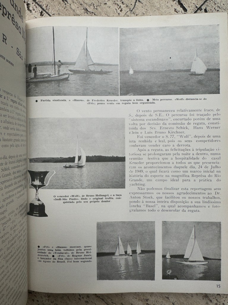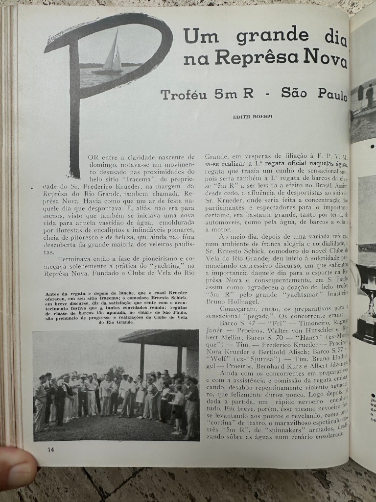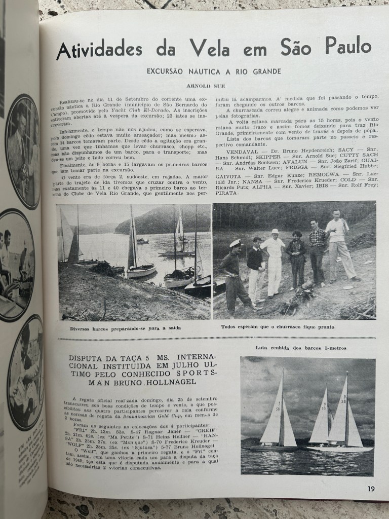 Em reportagem da Revista Yachting Brasileiro No. 58 de agosto de 1949, Edith Boehm escreveu; “Assim, desde cedo, a afluência de desportistas ao sítio do Sr. Krueder, onde seria feita a concentração dos participantes e espectadores para o importante certame, era bastante grande, tanto por terra de automóveis, como pela água, de barcos a vela e motor. Ao meio-dia, depois de uma variada refeição num ambiente de franca alegria e cordialidade, o Sr. Ernesto Schick, comodoro do novo Clube de Vela do Rio Grande, deu início à solenidade pronunciando expressivo discurso, em que salientou a importância daquele dia para o esporte na Represa Nova e, consequentemente, em São Paulo, assim como agradeceu a doação do belo troféu “5m R” pelo grande “yachtsman” brasileiro Bruno Hollnagel. Começaram, então, os preparativos para a sensacional “pegada”. Os concorrente eram: Barco S.47 — “Fri” – Timoneiro, Ragnar Janér – Proeiros, Walter von Hutschler e Robert Mellin; Barco S.70 – “Hansa” (ex “Monique”) – Timoneiro Frederico Krueder – Proeiro Nora Krueder e Berthold Alisch; Barco S.77 – “Wolf” (ex “Sjutusa“) – Timoneiro Bruno Hollnagel – Proeiros, Bernhard Kurz e Albert Idzenga.