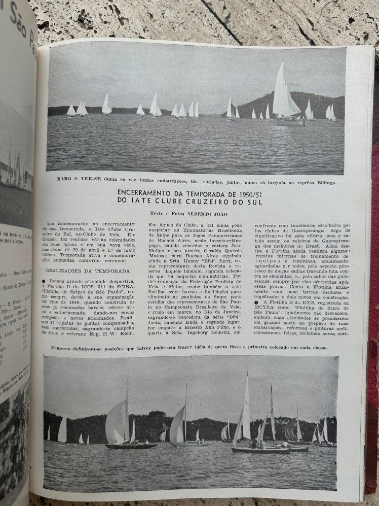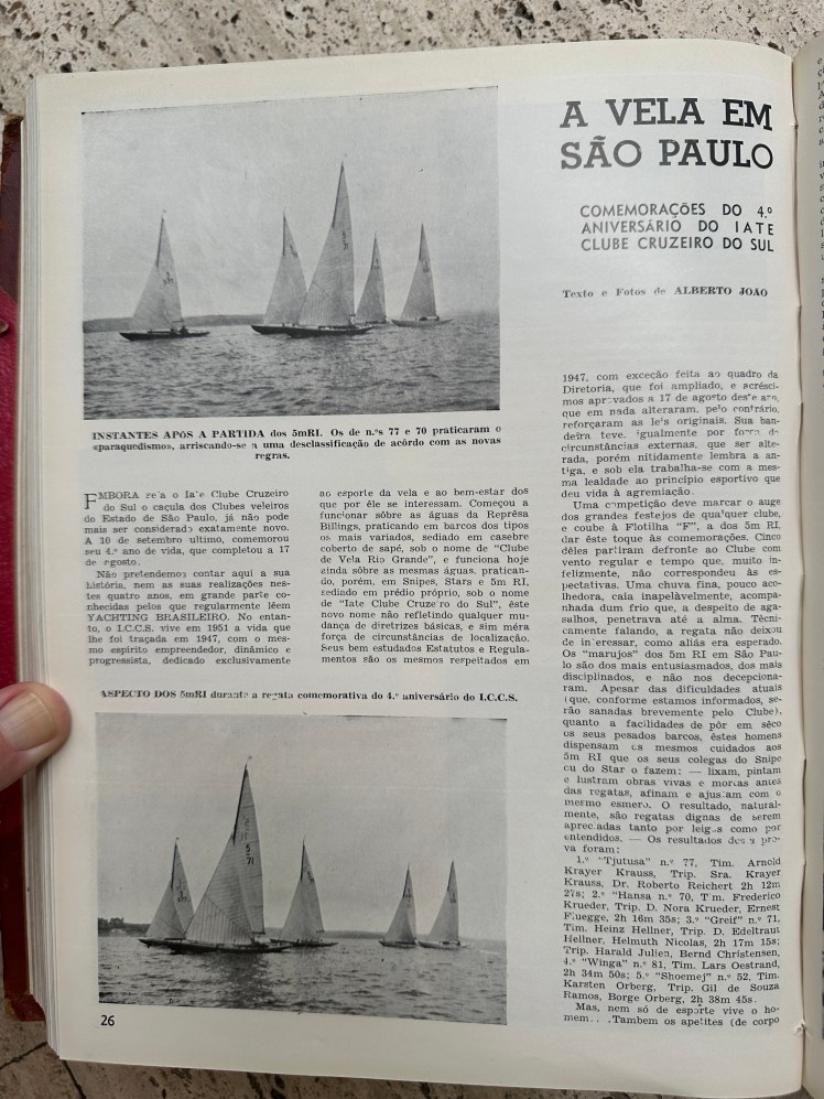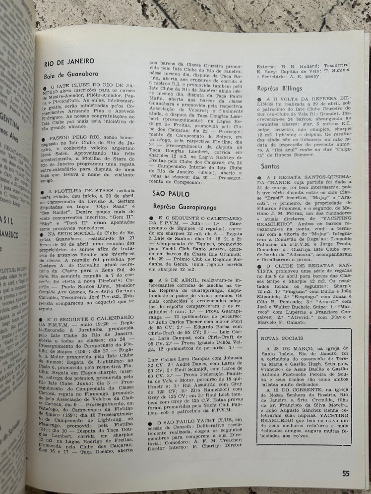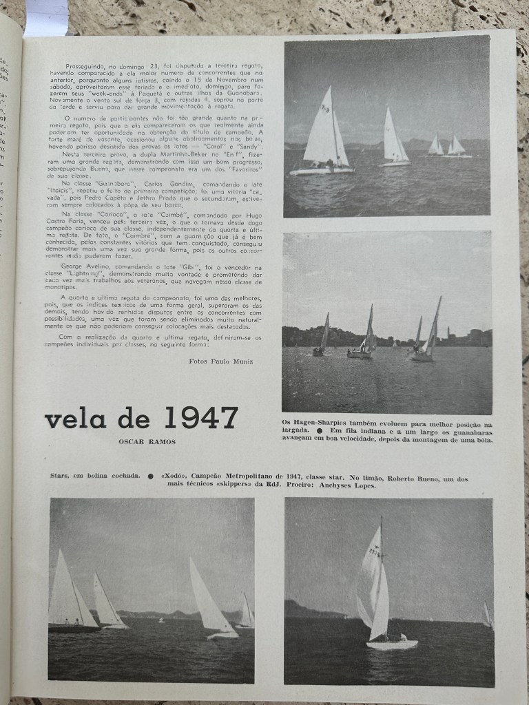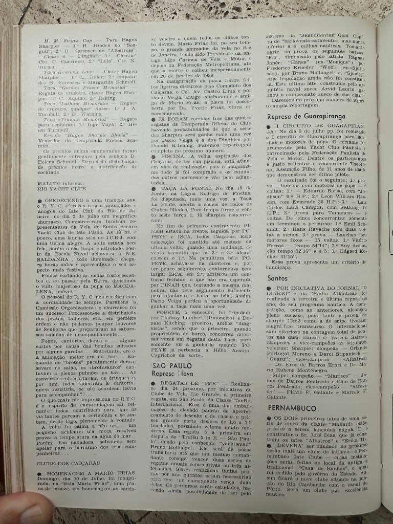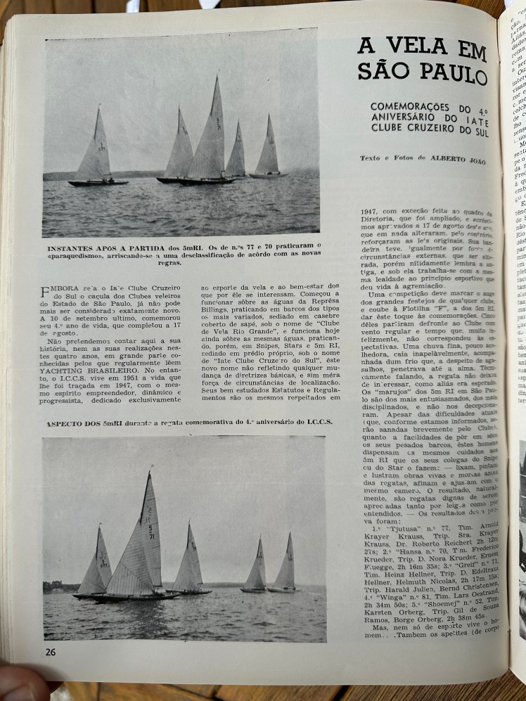 “Apesar das dificuldades atuais (que, conforme estamos informados, serão sanadas brevemente pelo Clube), quanto a facilidades de pôr em seco os seus pesados barcos, estes homens dispensam os mesmos cuidados aos 5m RI que os seus colegas do Snipe ou do Star o fazem: lixam, pintam e lustram obras vivas e mortas antes das regatas, afinam e ajustam com o mesmo esmero. O resultado, naturalmente, são regatas dignas de serem apreciadas tanto por leigos como por entendidos“.
