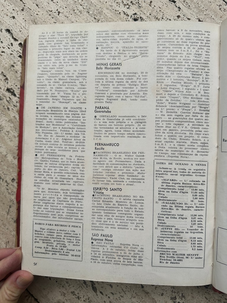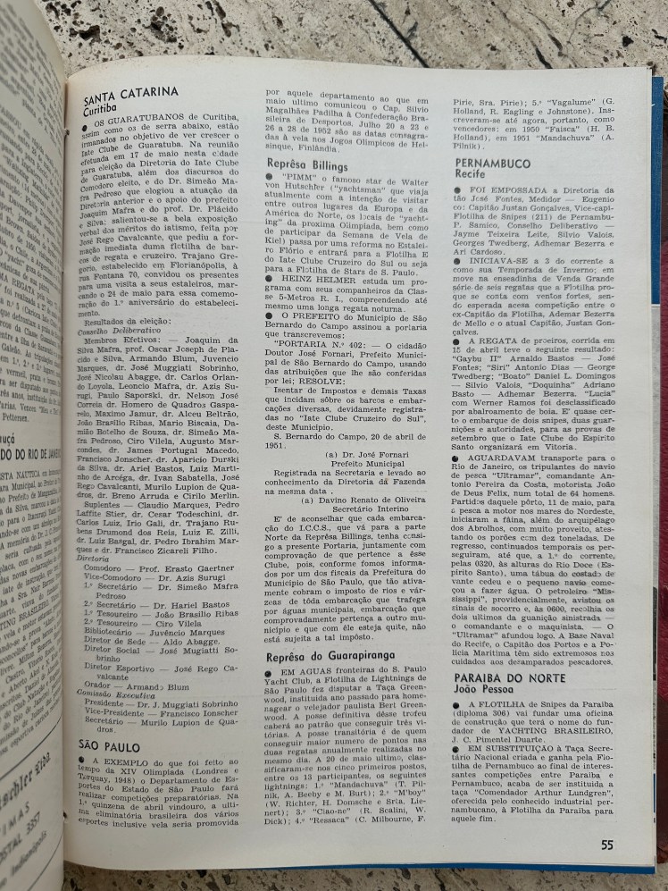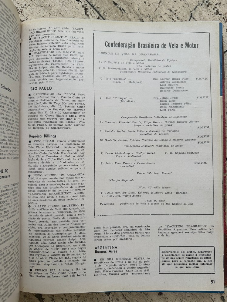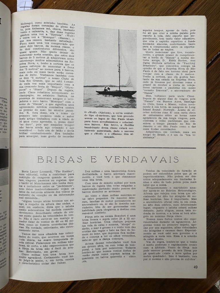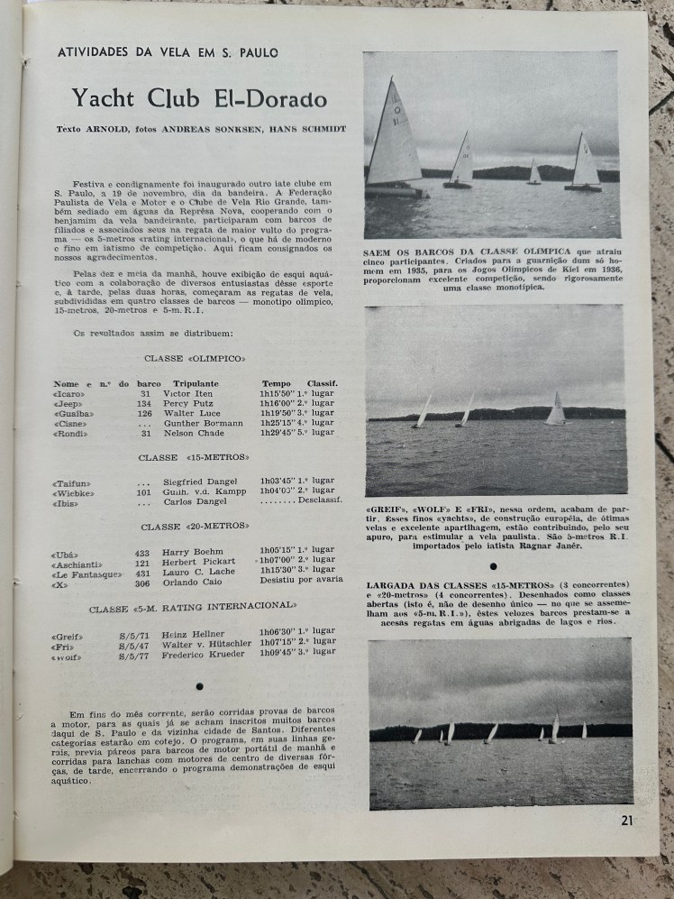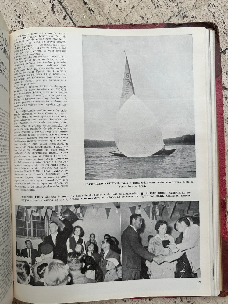 “Apesar das dificuldades atuais (que, conforme estamos informados, serão sanadas brevemente pelo Clube), quanto a facilidades de pôr em seco os seus pesados barcos, estes homens dispensam os mesmos cuidados aos 5m RI que os seus colegas do Snipe ou do Star o fazem: lixam, pintam e lustram obras vivas e mortas antes das regatas, afinam e ajustam com o mesmo esmero. O resultado, naturalmente, são regatas dignas de serem apreciadas tanto por leigos como por entendidos“.