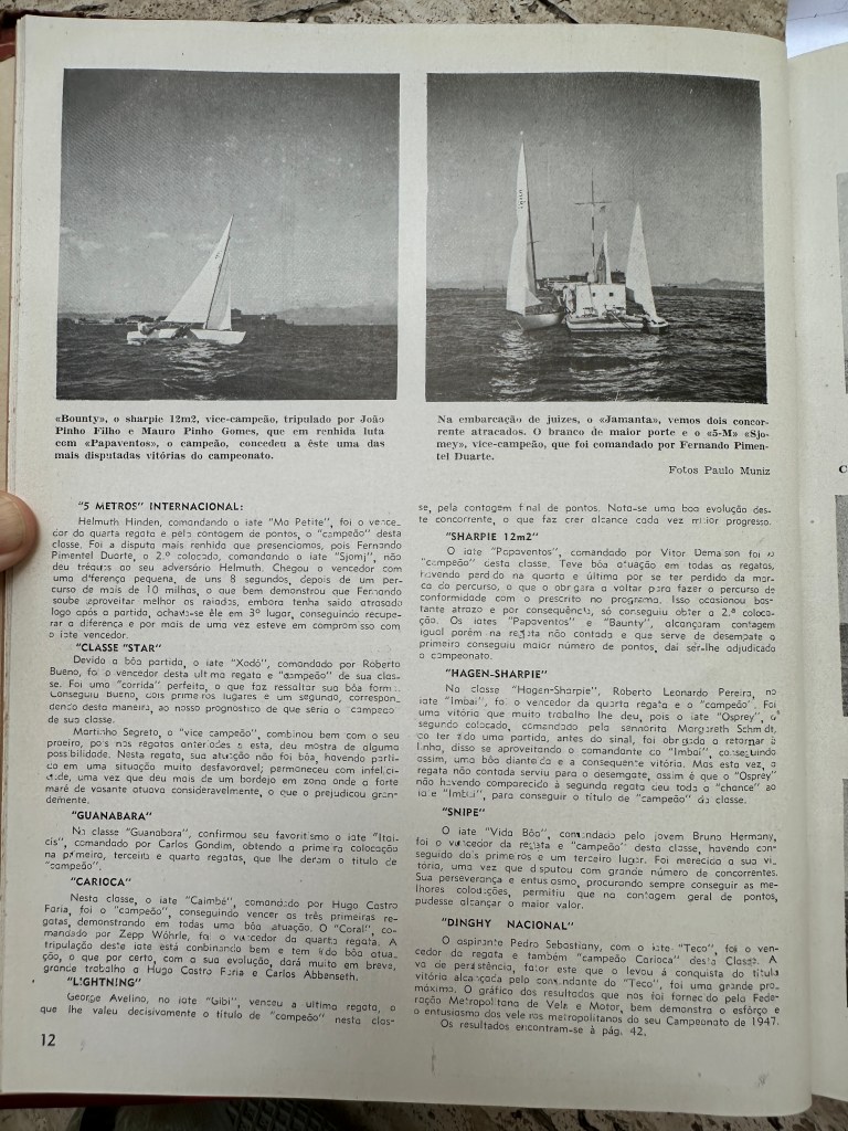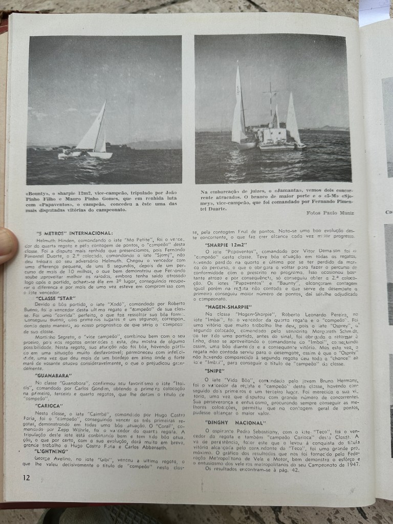 Em reportagem da Revista Yachting Brasileiro (No. 39 de janeiro de 1948), Oscar Ramos comentou; “Helmuth Hinden, comandando o iate “Má Petite”, foi o vencedor da quarta regata e pela contagem de pontos, o “campeão” desta classe. Foi a disputa mais renhida que presenciamos, pois Fernando Pimentel Duarte, o 2º colocado, comandando o iate “Sjomej”, não deu tréguas ao seu adversário Helmuth. Chegou o vencedor com uma diferença pequena, de uns 8 segundos, depois de um percurso de mais de 10 milhas, o que bem demonstrou que Fernando soube aproveitar melhor rajadas, embora tenha saído atrasado logo após a partida, achava-se ele em 3° lugar, conseguindo recuperar a diferença e por mais de uma vez esteve em compromisso com o iate vencedor.“.