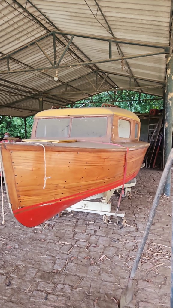 - Esta “lanchinha” chamada “Gostosão” é na realidade um veleiro da classe Seagull (conforme as medidas passadas, pelo design do casco e pelos bancos ao longo do costado) “adaptado” para ser uma lancha. Repare no interior e nas dobradiças no espelho de popa, claramente montadas para usar um leme externo com cana de leme.