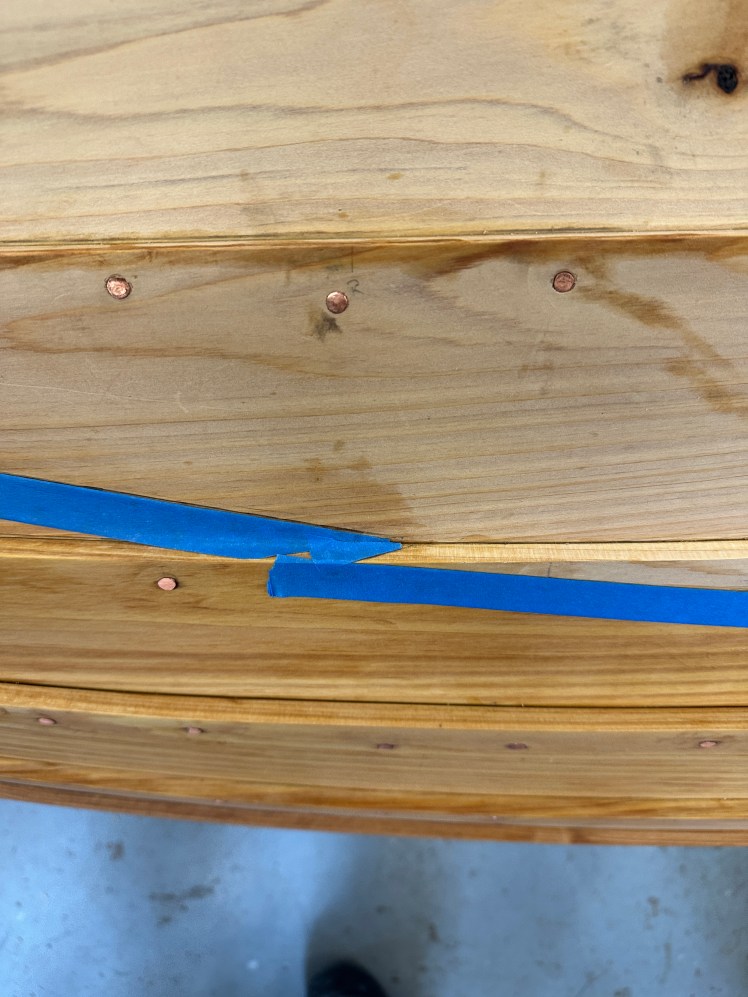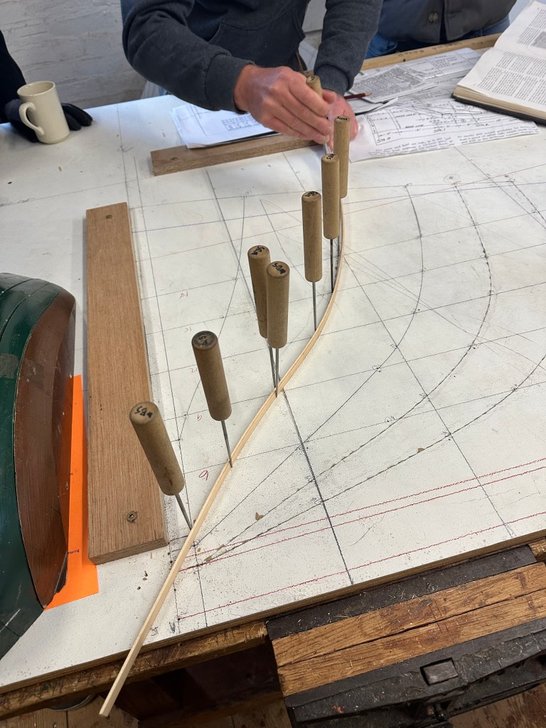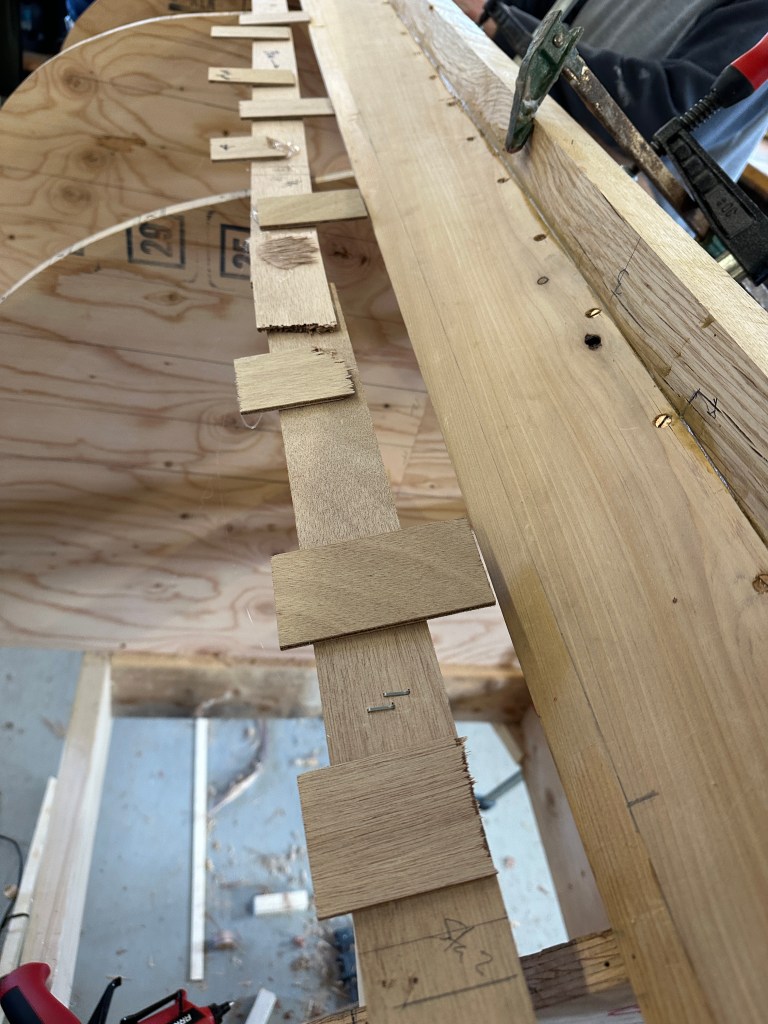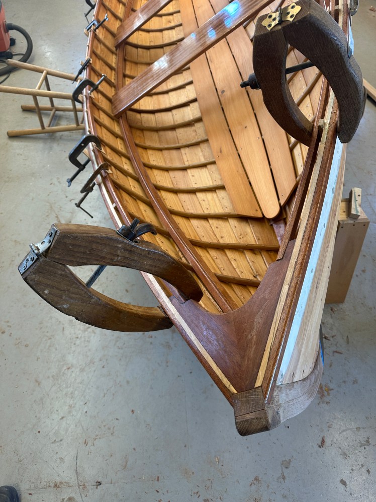 Também fomos lembrados pelo instrutor Bruce, que se mexêssemos na posição onde as ripas se unem às extremidades da proa (rabbit), subindo um pouco a ripa em direção ao deck, o “visual” das linhas do casco ficam mais agradáveis…, para você ter uma ideia, mexemos na posição das ripas e adicionamos quase uma polegada à cada uma na borda original da proa, o que fez com que as linhas do casco ficassem muito mais “fluídas” e “agradáveis”.