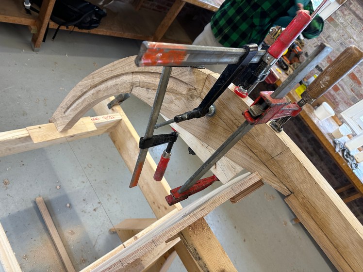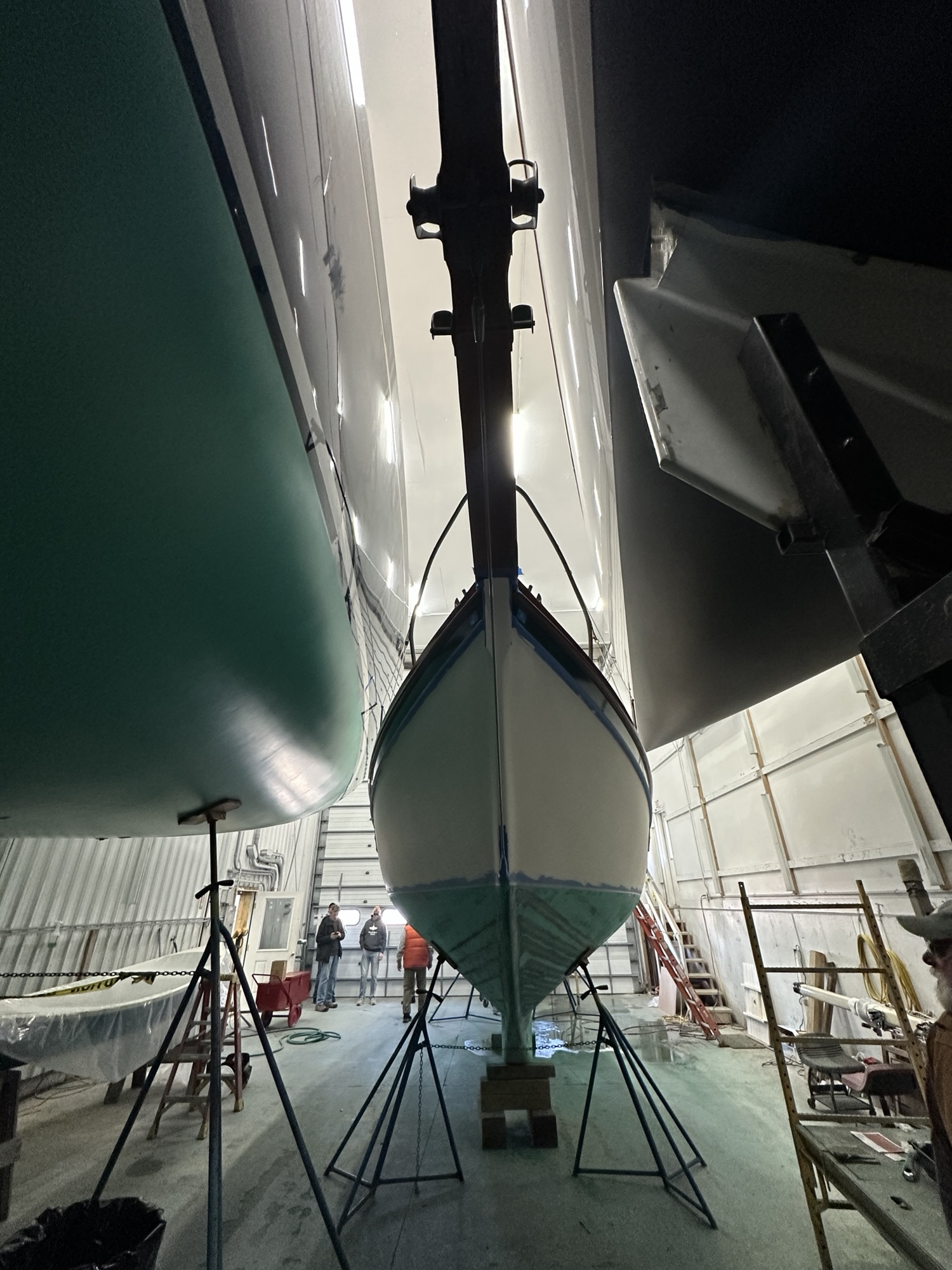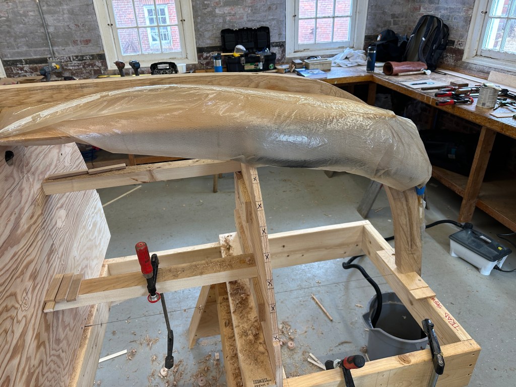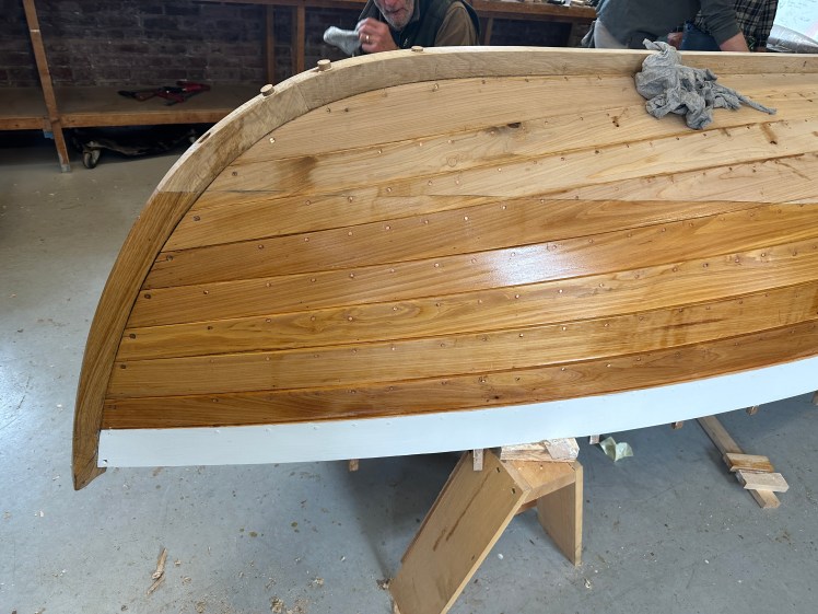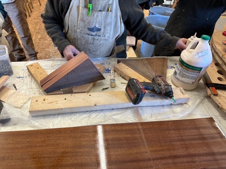 Também fomos lembrados pelo instrutor Bruce, que se mexêssemos na posição onde as ripas se unem às extremidades da proa (rabbit), subindo um pouco a ripa em direção ao deck, o “visual” das linhas do casco ficam mais agradáveis…, para você ter uma ideia, mexemos na posição das ripas e adicionamos quase uma polegada à cada uma na borda original da proa, o que fez com que as linhas do casco ficassem muito mais “fluídas” e “agradáveis”.