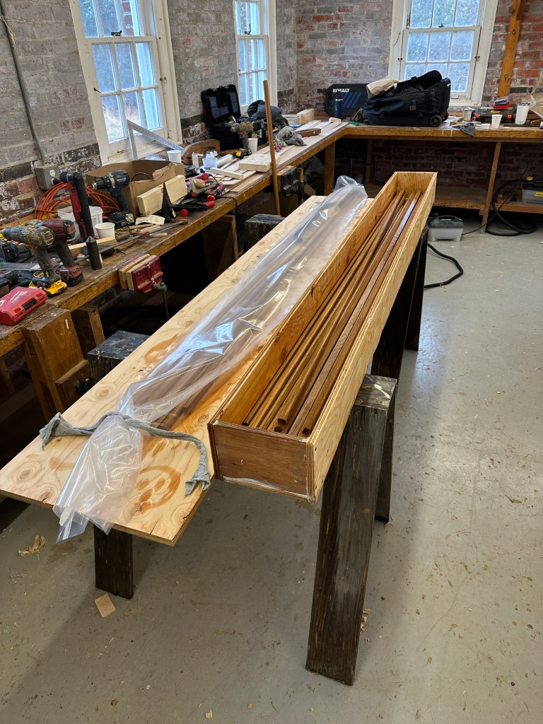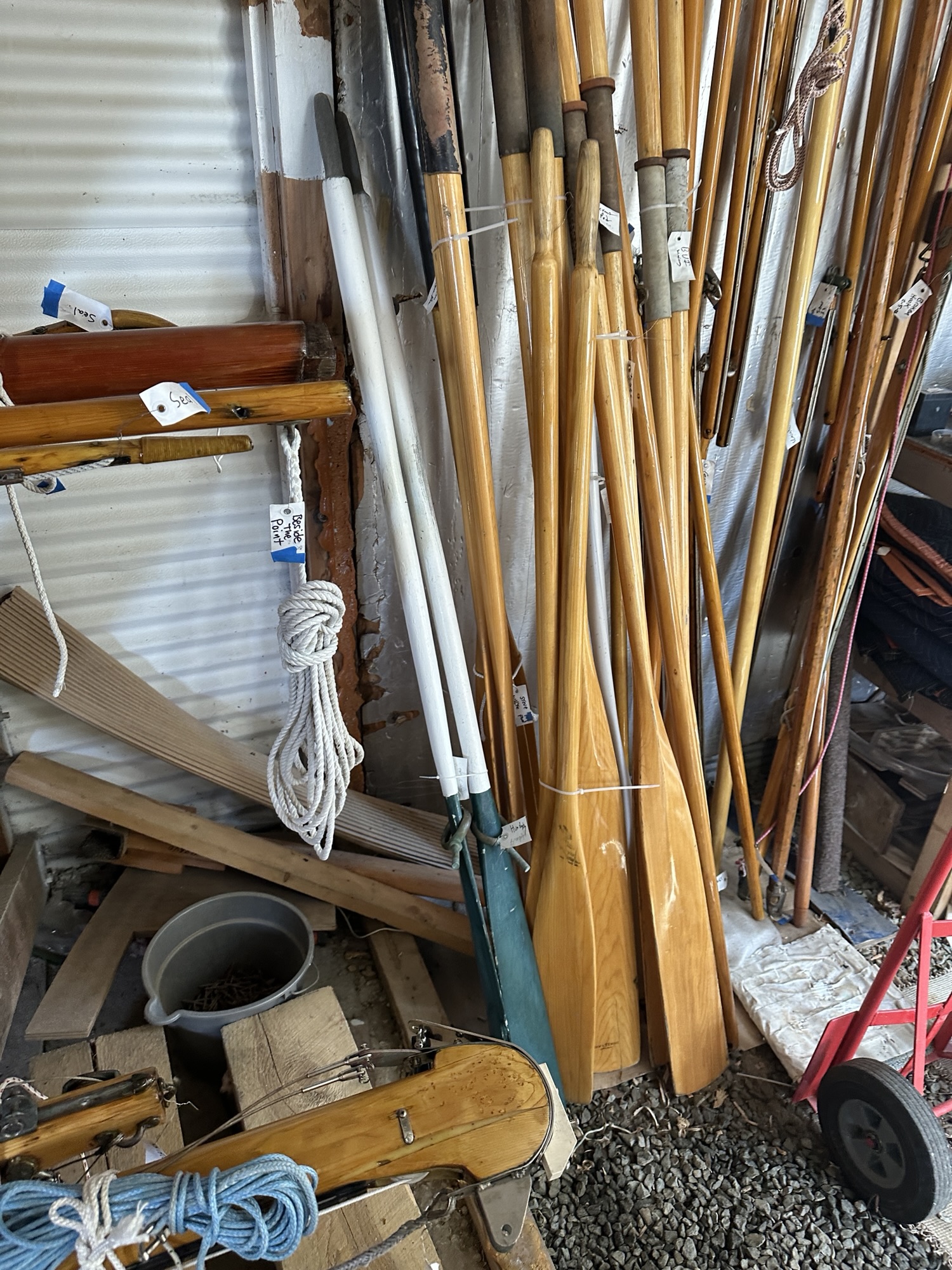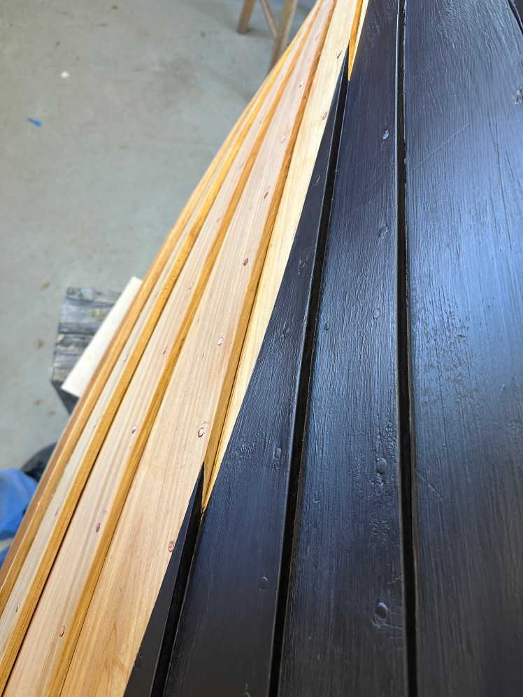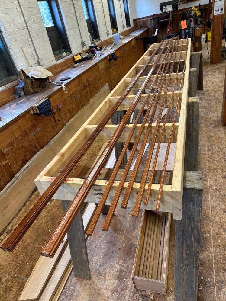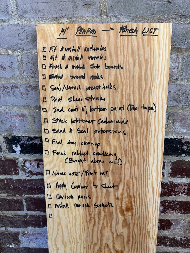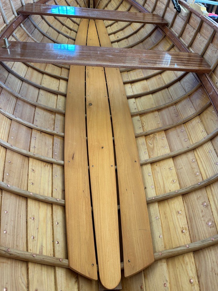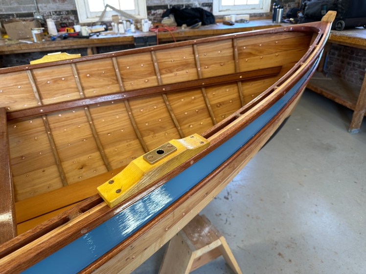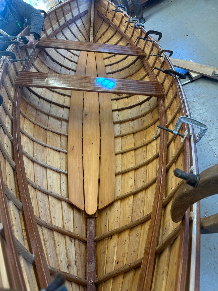 Os próximos passos, que vou resumir para não me alongar no texto, apesar de também serem partes estruturais e importantes na construção do Peapod, são também acabamentos, e incluem, o corte e a instalação das madeiras de suporte dos assentos, o corte e a instalação dos dois assentos, o corte das pontas das ripas que ficam para fora da última madeira do costado, a instalação dos “talha-mares” em ambas as proas, o corte preciso e a instalação do “alcatrate” (gunwhale) ou “tábua de forro da borda” (madeira colocadas de proa a popa, prendendo-se às extremidades superiores das cavernas, determinando o “tosamento” da embarcação), a pintura em um “azul acinzentado” da última tábua do costado (sheer), a colocação dos “verdugos” (borda do convés ou peça de acabamento de borda, que serve de proteção contra impactos além de reforço estrutural) inferior e superior e, por fim, o suporte dos remos (feitos com a madeira Osage Orange – Maclura pomifera -, ou laranjeira-de-osage, conhecida por ser extremamente densa, dura e durável, apresentando uma cor amarelo-alaranjada vibrante).