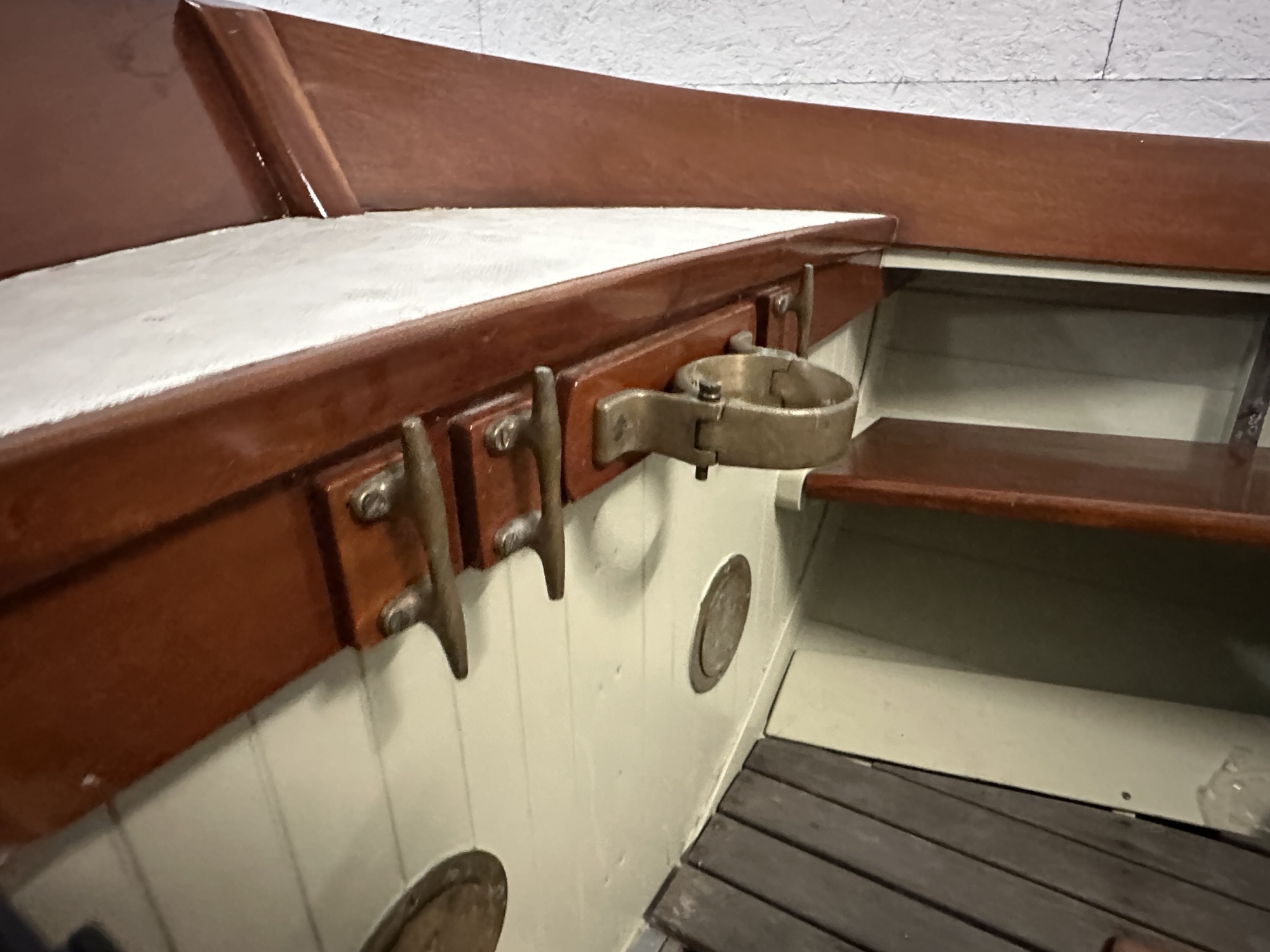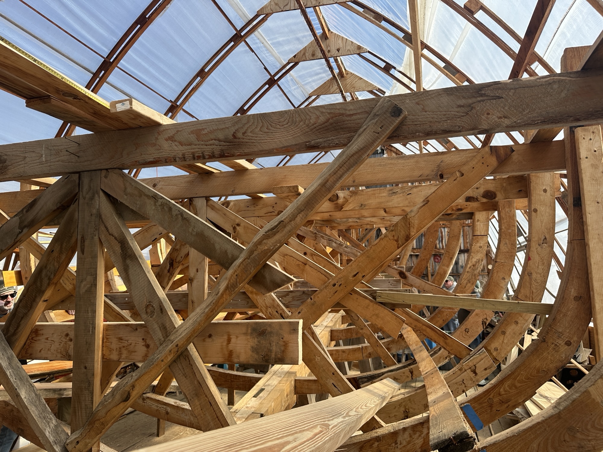 Quando chegamos à última tábua do costado (sheer), retiramos o casco do molde, viramos o casco e instalamos “travessas transversais” de madeira para “travar” e manter o formato do casco (que deve ter uma boca máxima de 49 ½’ no interior da última tábua do costado), até que a ripas do cavername (ribs ou frames) sejam encaixadas no casco.