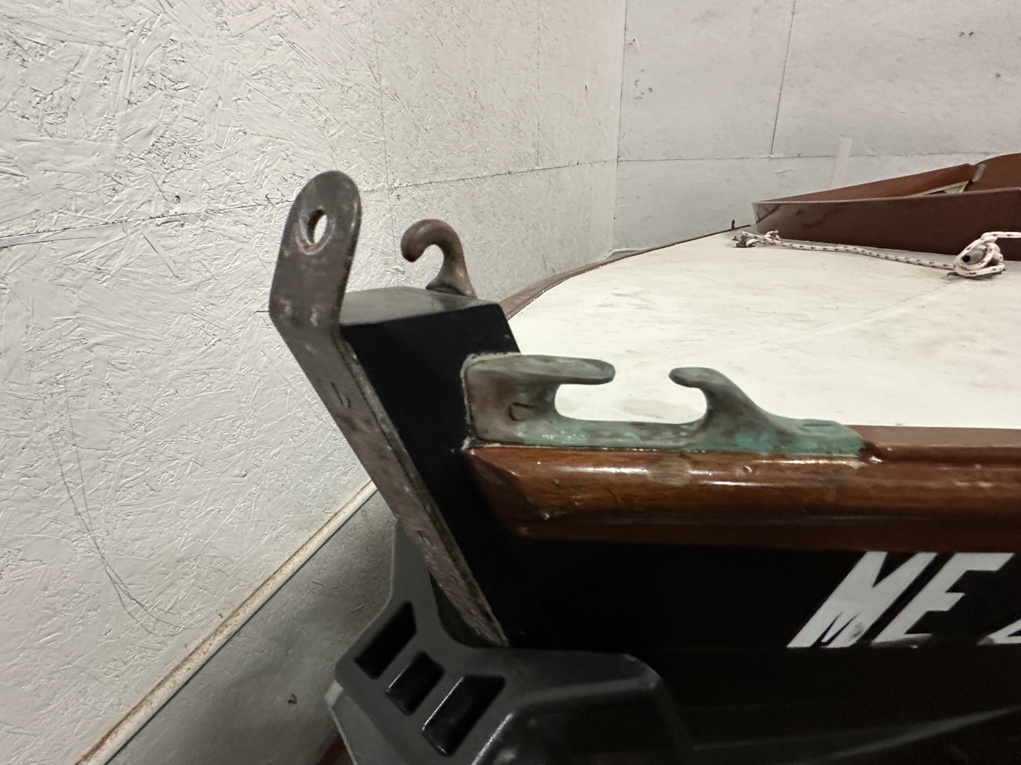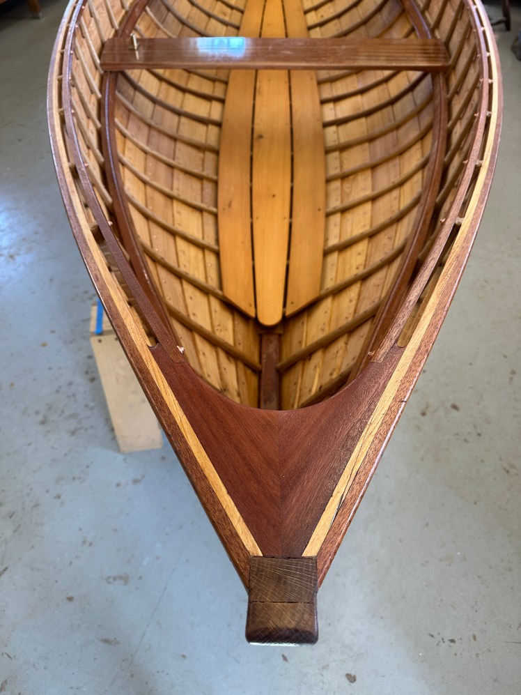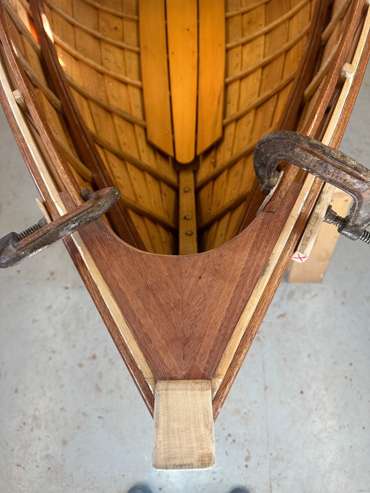 Uma outra parte importante que foi realizada pelo Bruce, por sua importância e trabalho artesanal, foi o que chamamos no Brasil de “coral de volta” ou “talha-mar”. Esta é uma peça estrutural crítica, moldada com precisão, para reforçar a ponta da proa e o encontro do costado. No caso do Peapod, por ter duas proas, foram necessárias talhar duas destas peças. O Bruce passou praticamente 2 dias trabalhando nelas. Talhando, conferindo seu encaixe e voltando a repetir todo o processo, trabalhando uma madeira que mais parecia pedra… não recordo bem, mas acredito que a madeira usada foi o mogno.