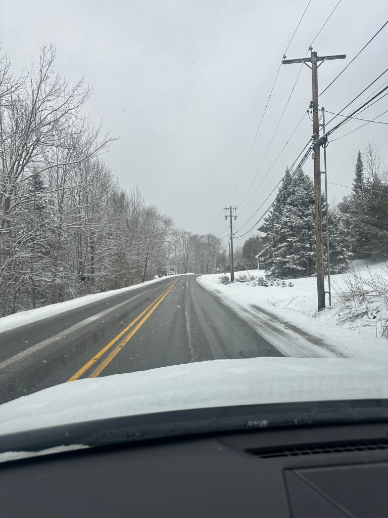 Demorei quase duas horas, dirigindo com cautela e observando maravilhado a neve cair, enquanto, dos pinheiros ao longo da estada, as “refegas” de vento forte, faziam com que estes se balançassem e lançassem uma neve fininha, que seguia as rajadas de vento como se fossem uma “nuvem de mosquitos brancos”.