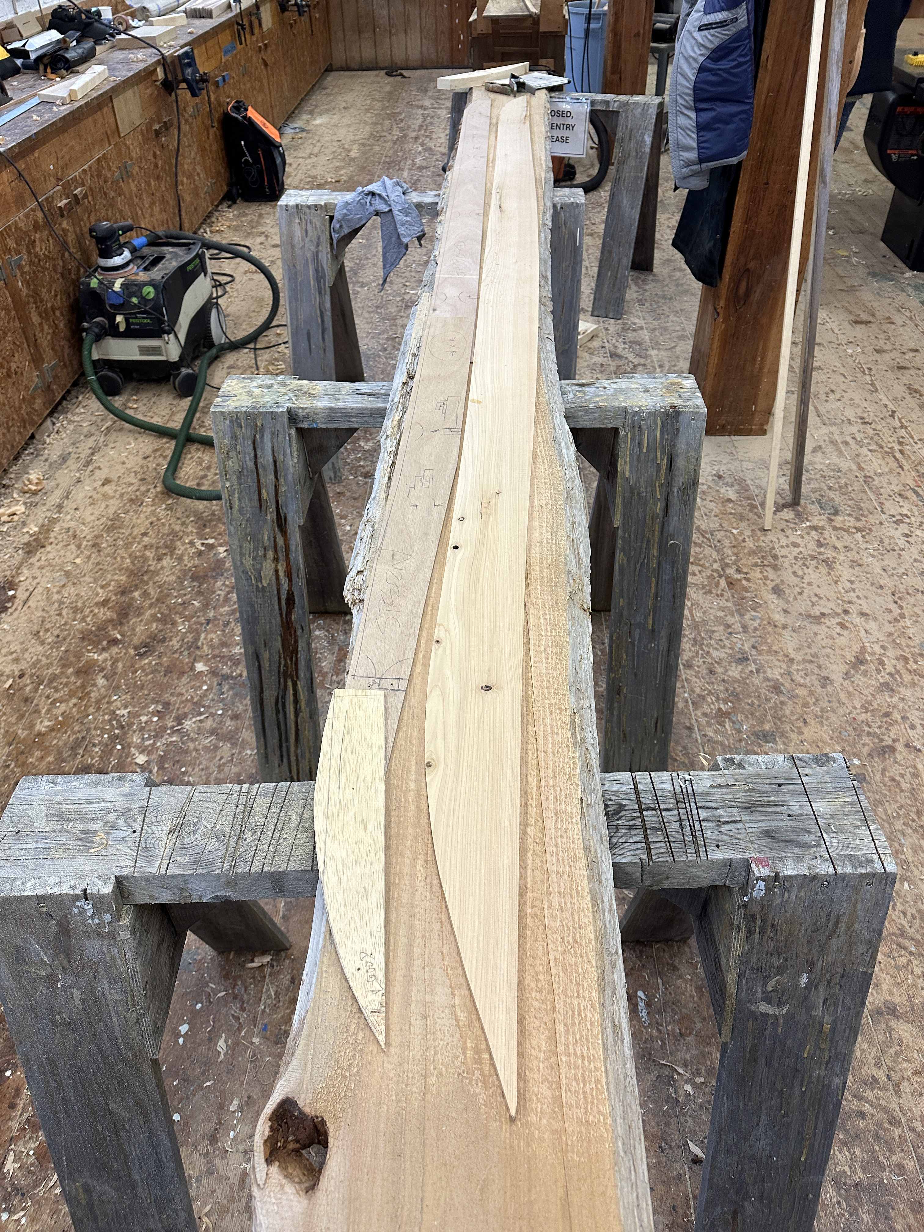 Antes de prosseguir no relato, gostaria de destacar de que, como este é um barco de casco “trincado” (lapstrake), onde as madeiras do casco irão se sobrepor umas às outras, as ripas, uma vez instaladas, têm o comprimento total e a largura real das suas sobreposições… isso significa que, quando olhamos e marcamos uma ripa, podemos ver a largura total das tábuas de madeira que precisaremos e o seu formato final quando tudo estiver pronto.