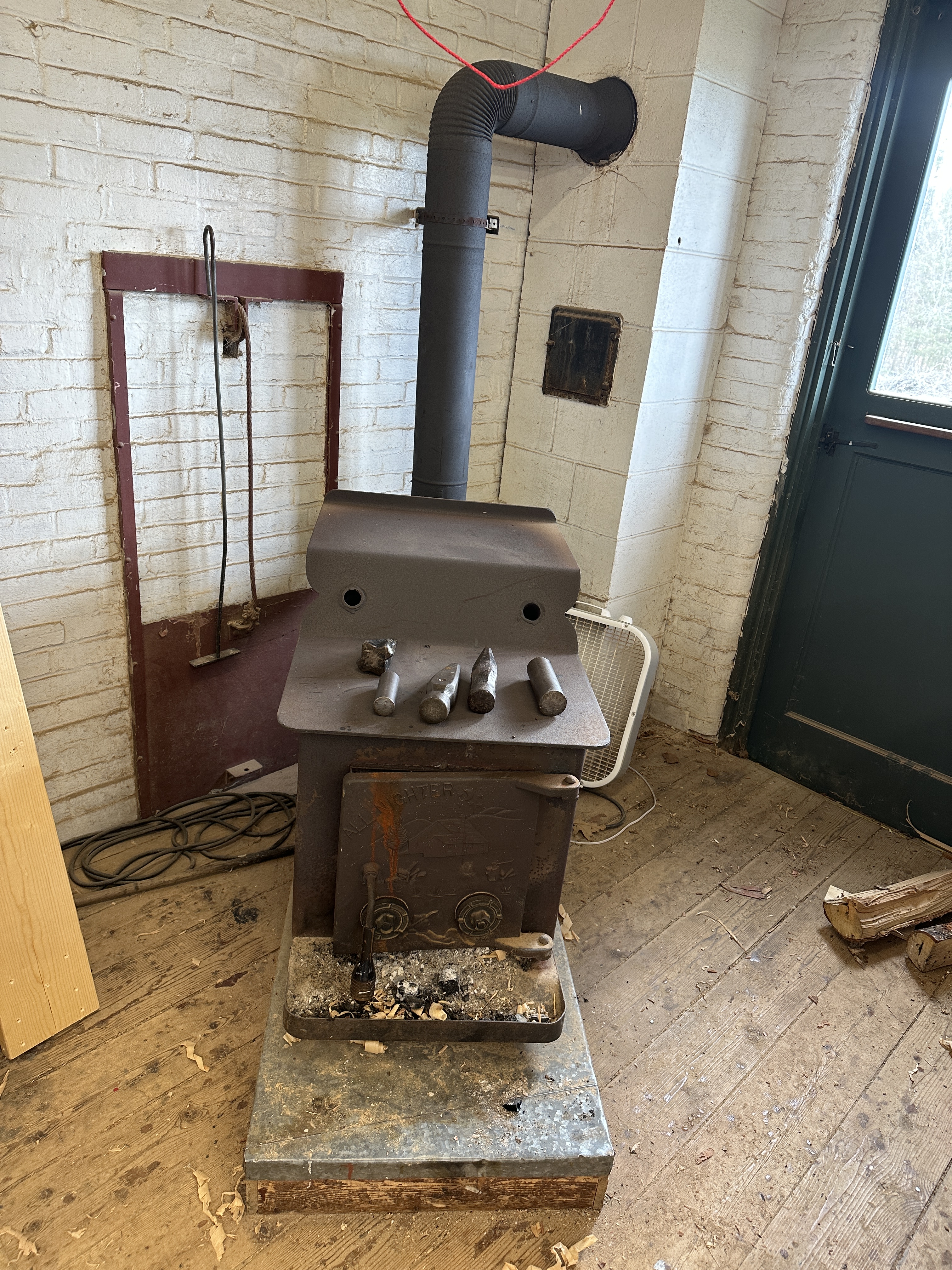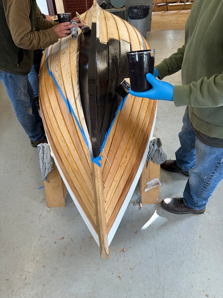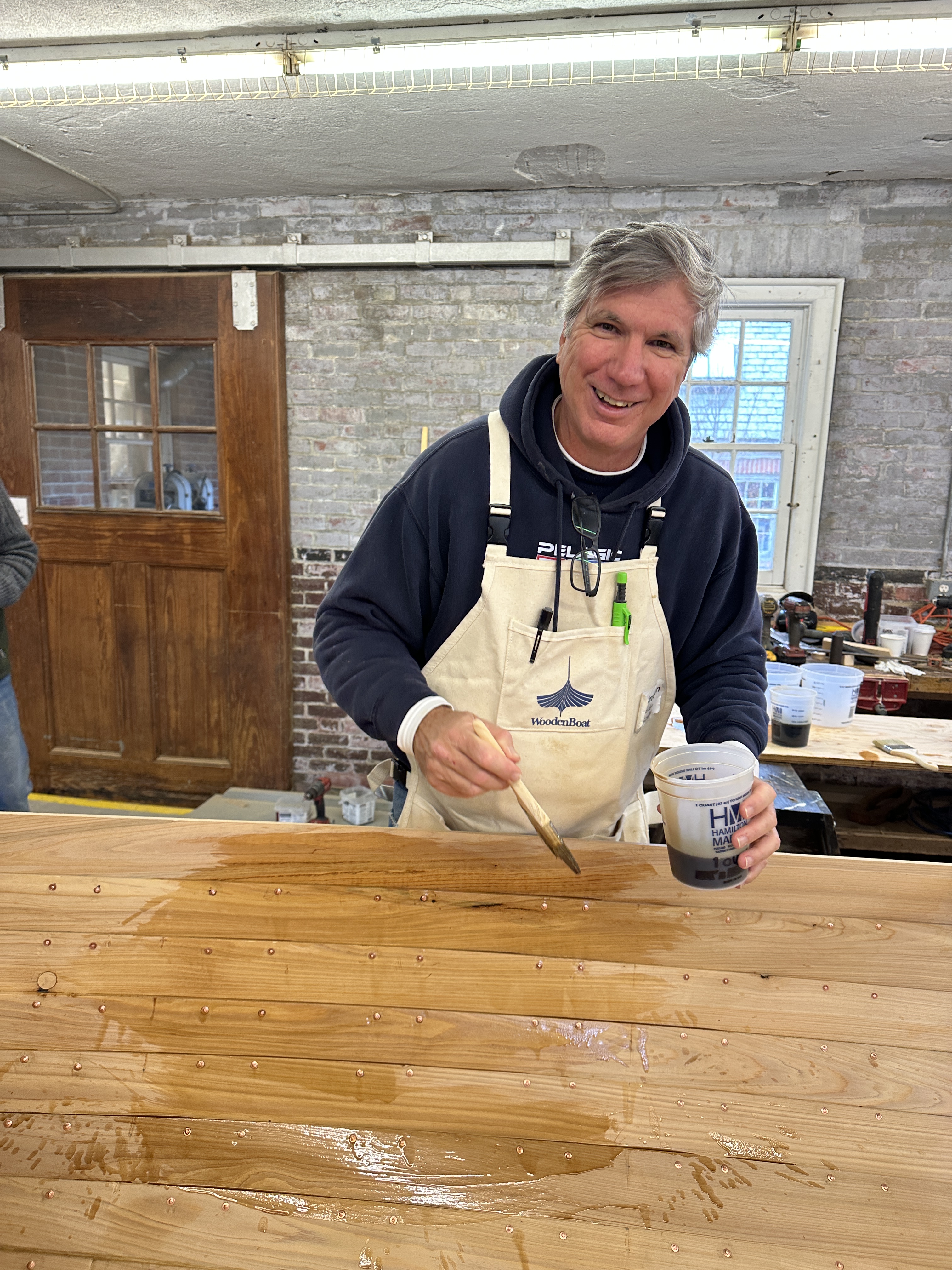 Foi neste momento que aplicamos, ou melhor, “lambuzamos”, todo o interior do casco com uma mistura de “Alcatrão de pinho, terebintina, verniz e secante japonês” (Pine tar, turpentine, varnish e japan drier) que fez a madeira brilhar. Cozinhamos esta mistura por uns 30 minutos em cima da antiga “Salamandra” (aquecedor de ferro a carvão) da oficina, oriunda da época em que o edifício (construído em 1916) era o estábulo dos cavalos da propriedade. Após uns 30 minutos, tempo necessário para a madeira absorver a mistura, secamos tudo com panos que foram depois deixados para secar do lado de fora por ser a mistura um pouco tóxica (o pessoal da Woodenboat School não brinca com a segurança pessoal dos alunos! Tudo que é feito, a qualquer momento, é sempre pensado e prevê algum procedimento de segurança!).