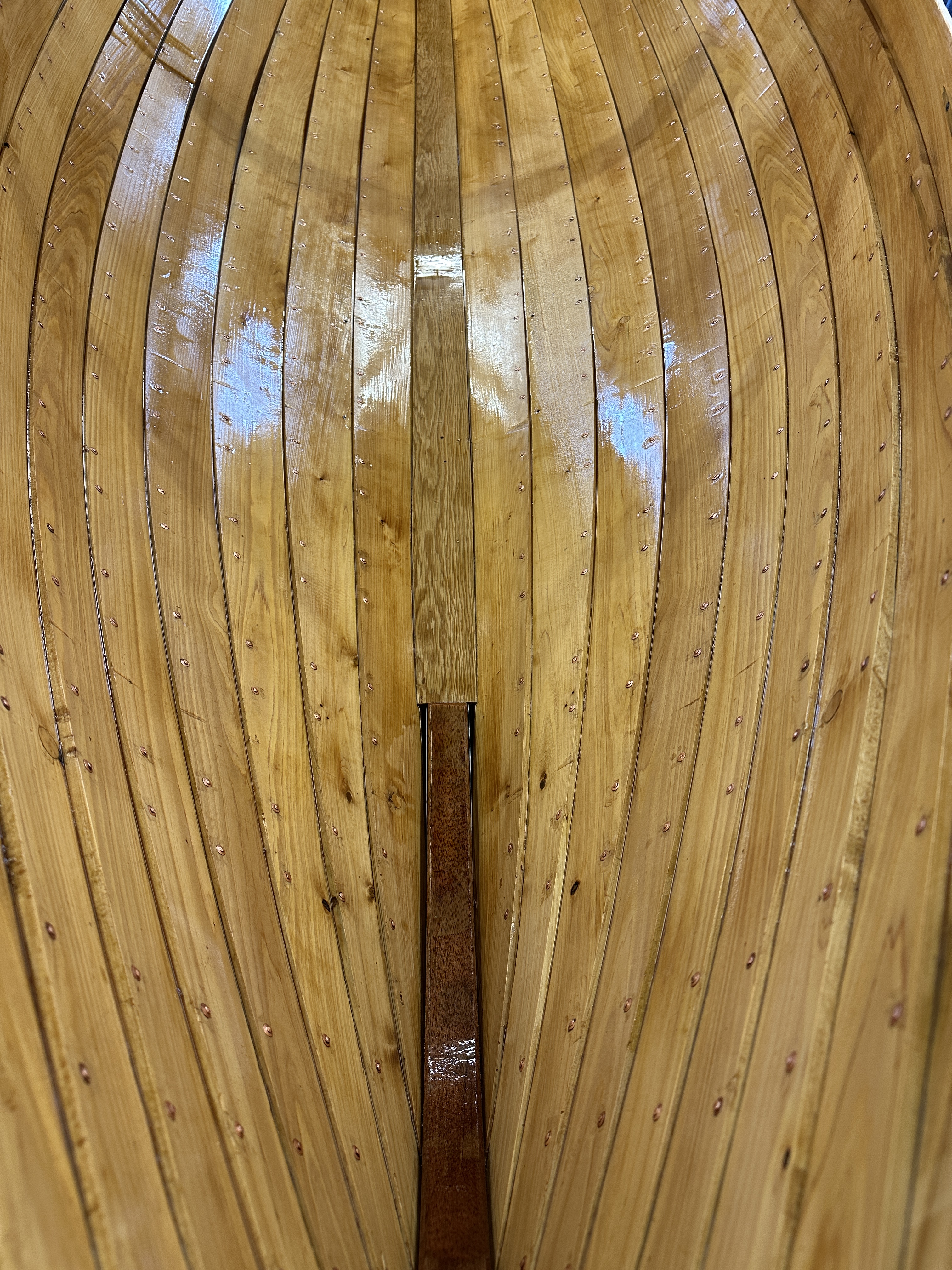 Com tudo isto finalizado e todos concordando de que as linhas do casco não só eram agradáveis aos olhos, mas que produziriam um belo casco, passamos ao “trabalho pesado”: cortar, lixar, encaixar, ajustar … repetir o processo inúmeras vezes até ficar perfeito e só então cozer no vapor (steaming) para, por fim, fixar as tábuas na quilha.