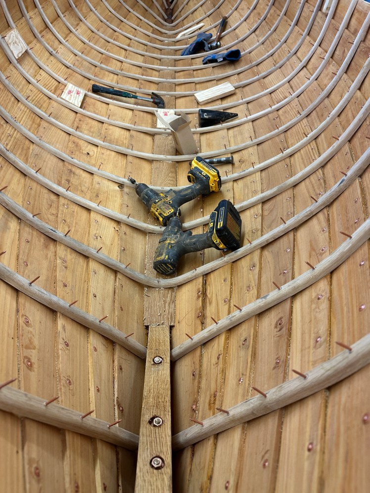 A próxima etapa, vai lidar com a fragilidade do casco pois é hora de cozer, retorcer no lugar e pregar com rebites, as ripas que compõe os cavernames que darão resistência estrutural ao casco.