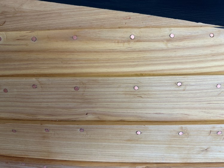 Agora o casco está “firme” e as duas “travessas transversais” de madeira podem ser retiradas, as arruelas inseridas, os pregos cortados e, com a parte arredondada do martelo, finalizar o rebite.