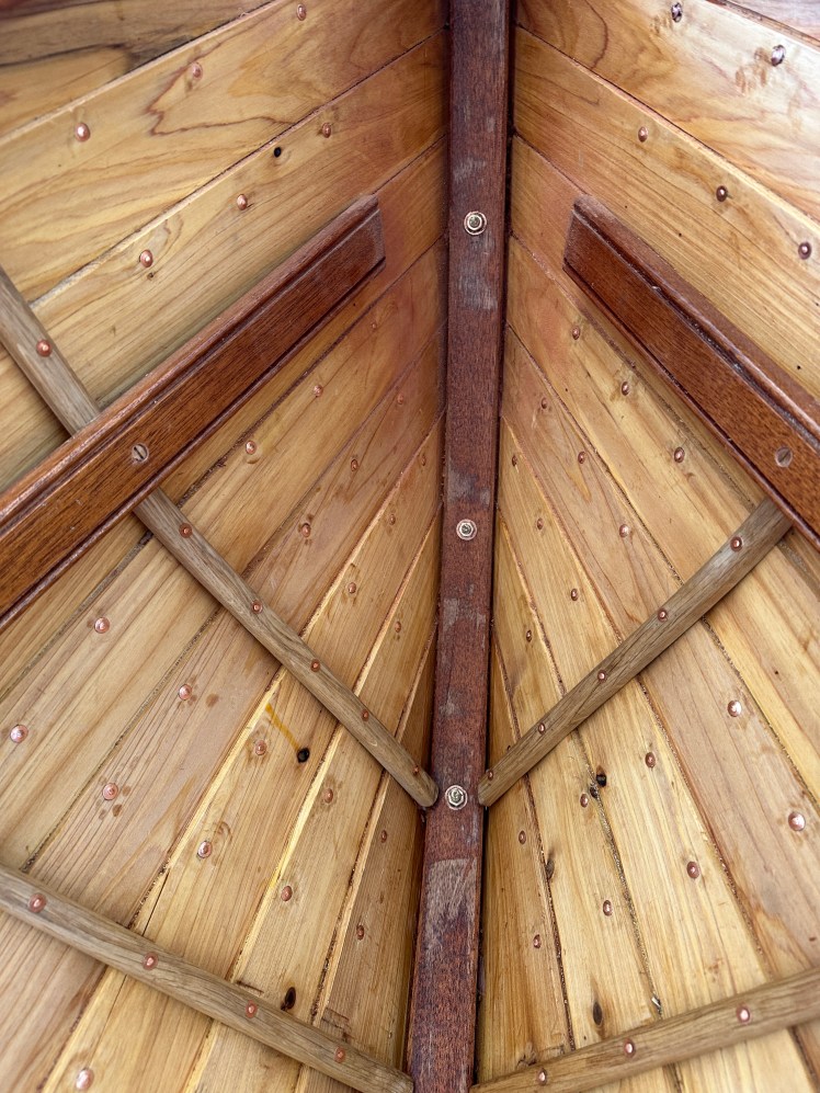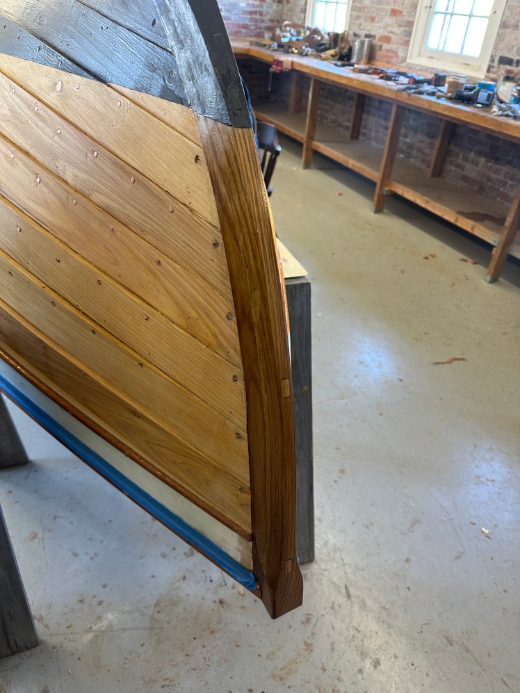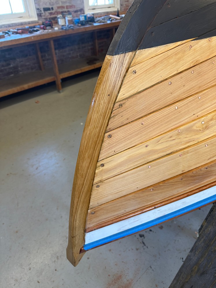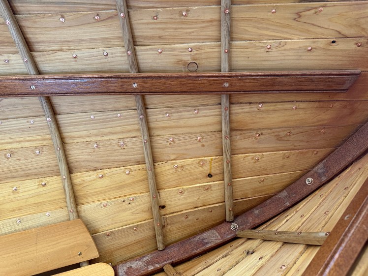 O corte das madeiras, ajustes, chanfro, cozimento, instalação e rebitagem (com pregos e arruelas de cobre entre as sessões do molde) se repetiu com o barco virado de ponta cabeça desde a tábua da quilha (garboard), até chegar na tábua instalada na curvatura do casco. Então, viramos o barco para facilitar a instalação e a rebitagem das novas tábuas que cobrirão o costado (daria para continuar na posição invertida, contudo, nesse caso, é necessário certo “malabarismo” para realizar a rebitagem).