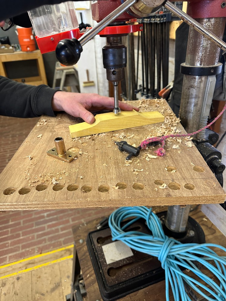 Na sequência, ainda mantendo pressão, as ripas são perfuradas com uma furadeira elétrica com broca fina e, o prego de rebite de cobre, martelado até o fim. Nesse momento, não é necessário (mas pode ser feito) colocar a arruela e rebitar, podendo, após pregar todos os pregos, passar para a próxima ripa do cavername.