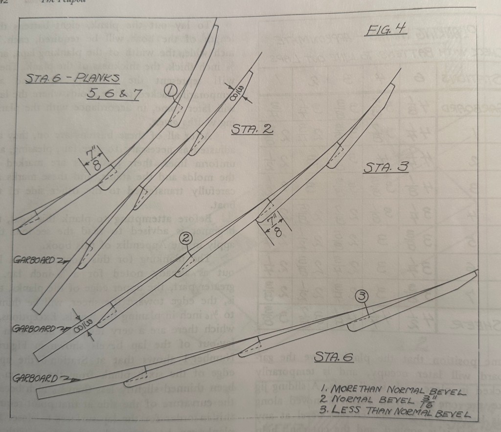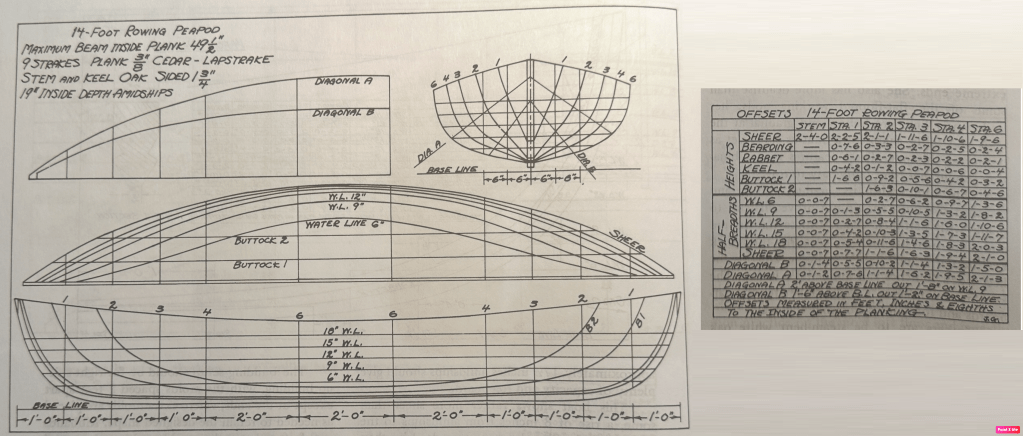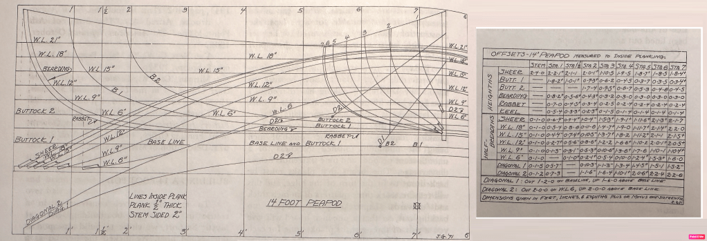 Grande parte do sucesso de um projeto de construção com tábuas sobrepostas (clinker), depende do número de tábuas, suas larguras e como elas se alinham. Nove tábuas são o ideal para este Peapod, e as larguras indicadas nas tabelas foram cuidadosamente calculadas em um meio-modelo (half model). Embora não sejam exatas, são bastante precisas.