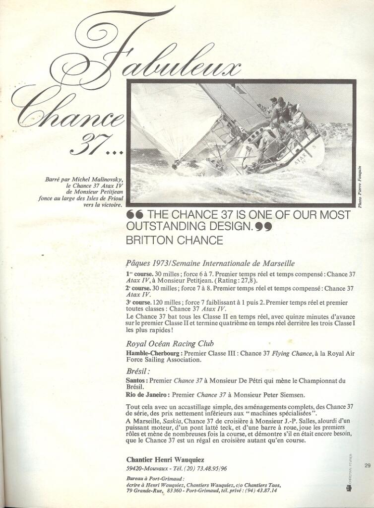 - Modelo: Wauquiez Chance 37 (One Ton Class) com 95 veleiros produzidos entre 1971 e 1977