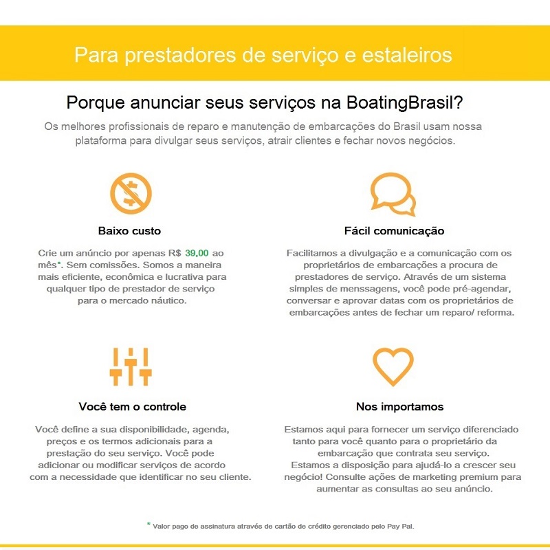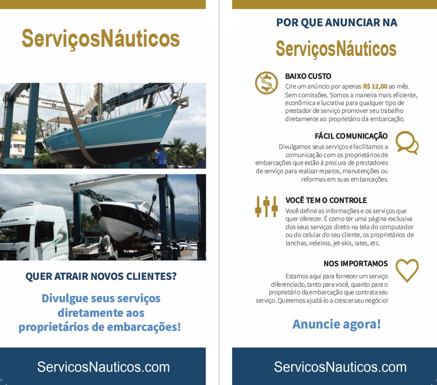 O Portal ServiçosNáuticos.com tem como objetivo permitir que proprietários de embarcações possam encontrar, próximo ao local do seu barco, em qualquer lugar do Brasil, profissionais para realizar manutenções e serviços em sua embarcação.