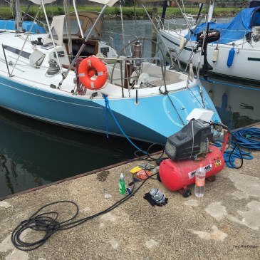 Preparativos para um viagem incluem uma limpeza das obras vivas do casco. Não dá para ver o Sr. Assis – mergulhador, somente seus equipamentos. Foto da semana de 07/01/2011 Autor: Max Gorissen