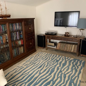 Biblioteca com livros de assuntos náuticos e piso forrado por um belo tapete confeccionado com base em uma vista aérea dos Lençóis Maranhenses. Foto da semana de 28/02/2022 Autor: Max Gorissen