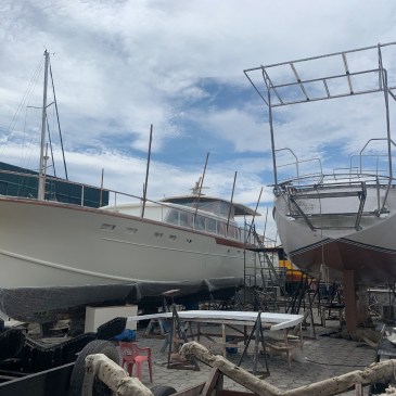 Yacht de madeira (deve ter uns 70 pés) fabricado nos USA em 1967 passando por reforma em estaleiro no Guarujá – SP. Ao lado, acredito ser um veleiro S&S de uns 50 pés, também passando por reforma. Foto da semana de 14/03/2022 Autor: Max Gorissen